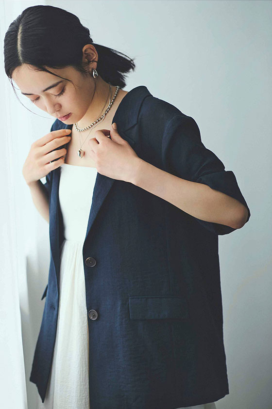 麻調ジャケットを羽織れば、よそ行きスタイルに格上げ。