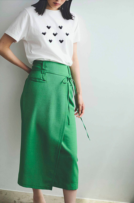 高見えするデザインのスカートが、普段のTシャツコーデを