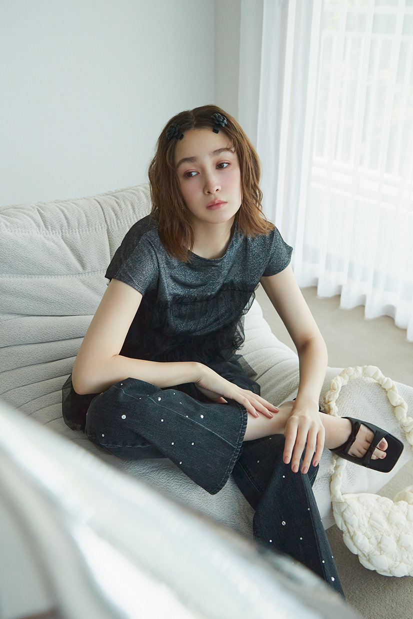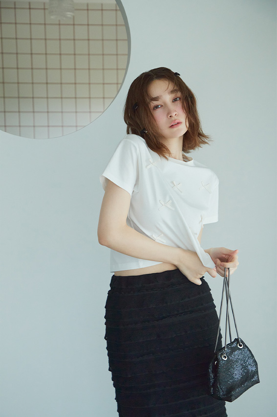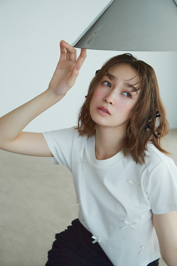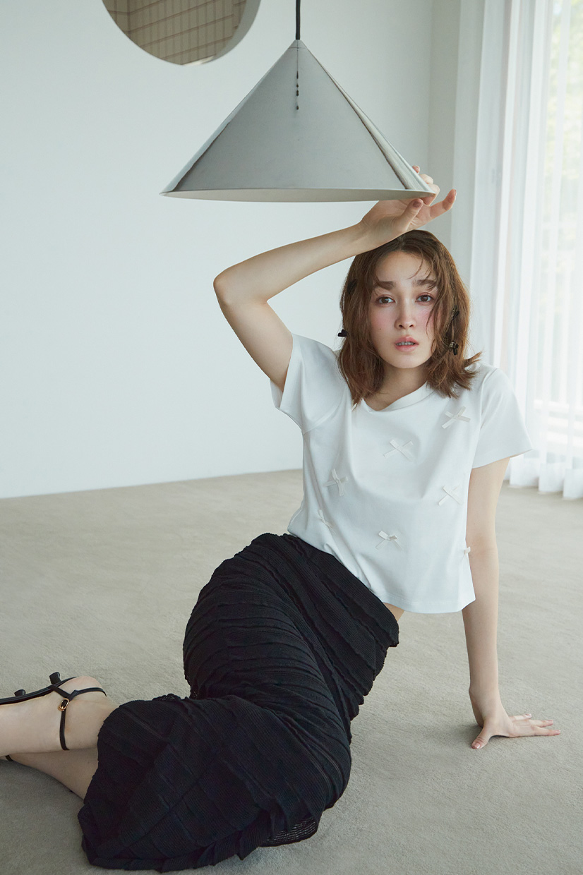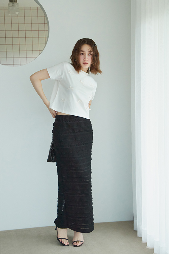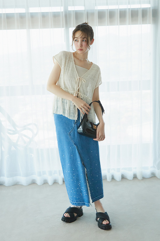 トレンドのレイヤードスタイルを1枚で完結できるトップス。