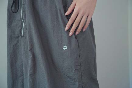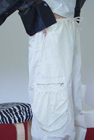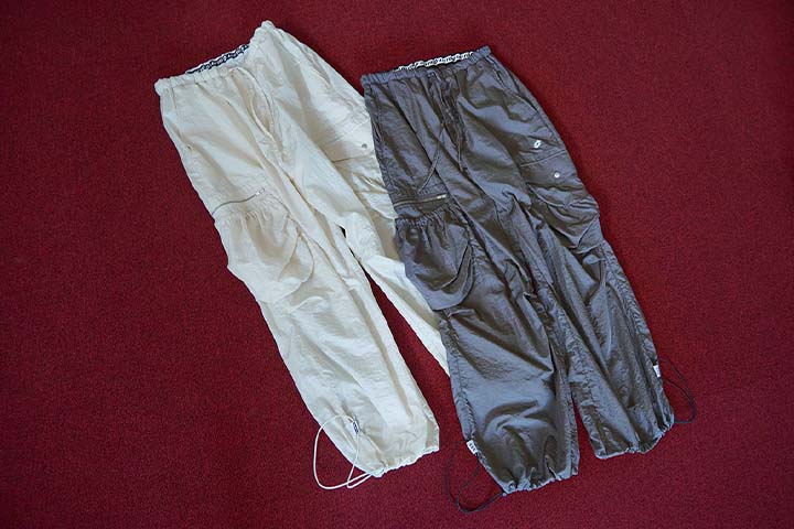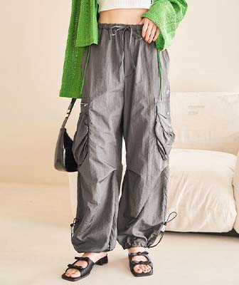 ポケットが個性的なナイロンカーゴパンツです。