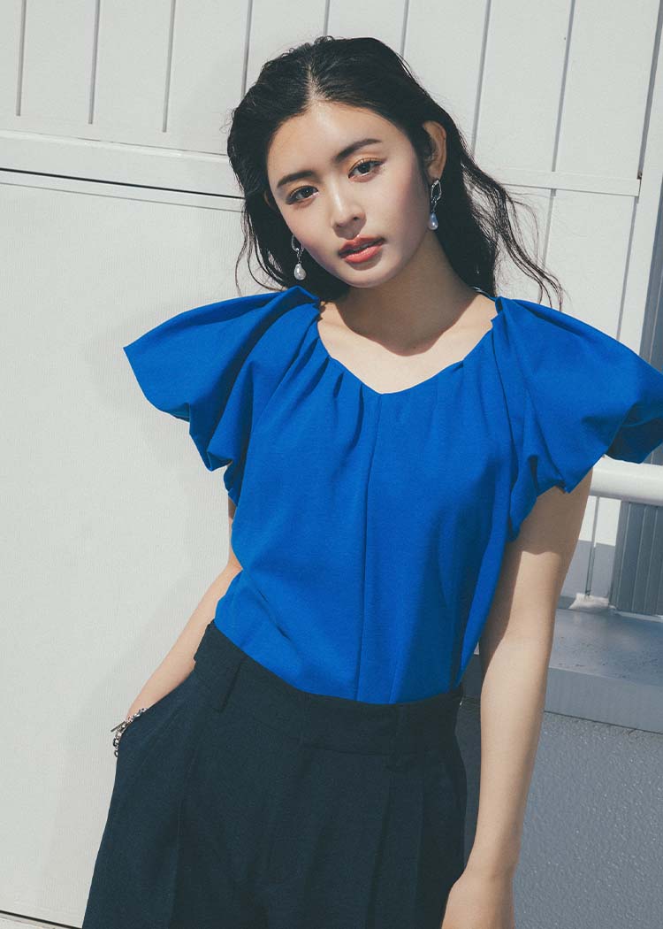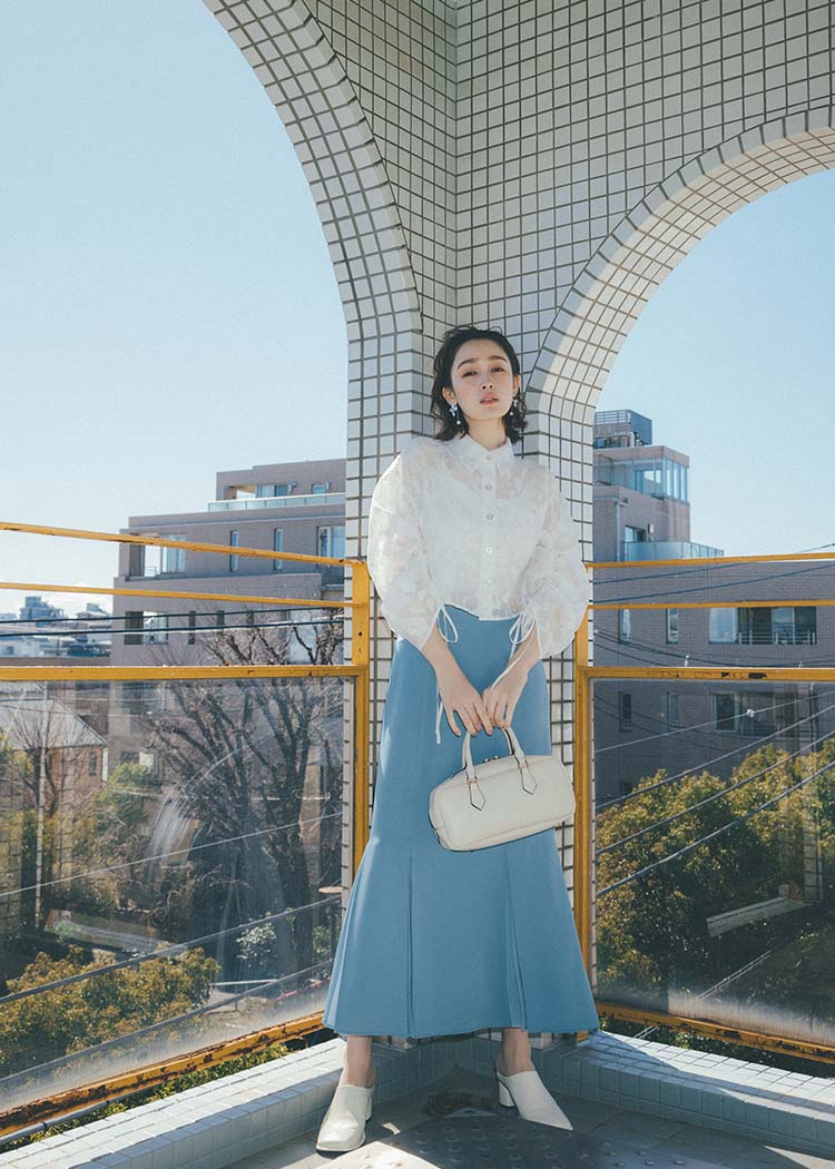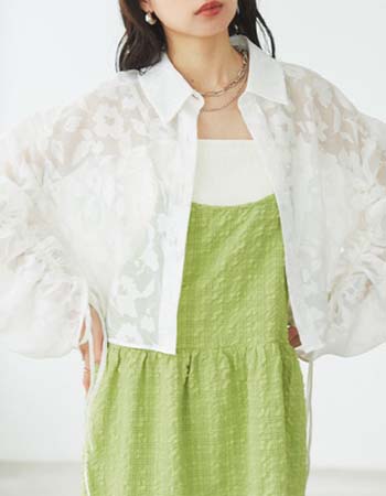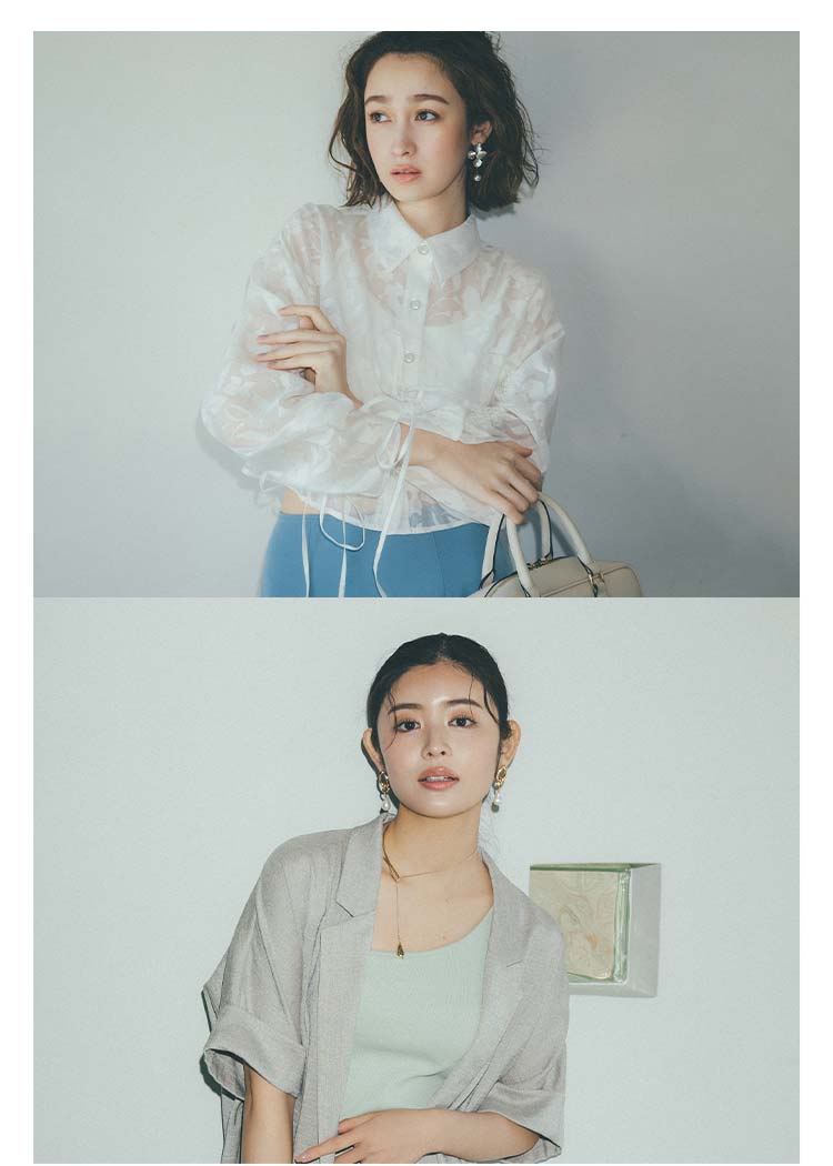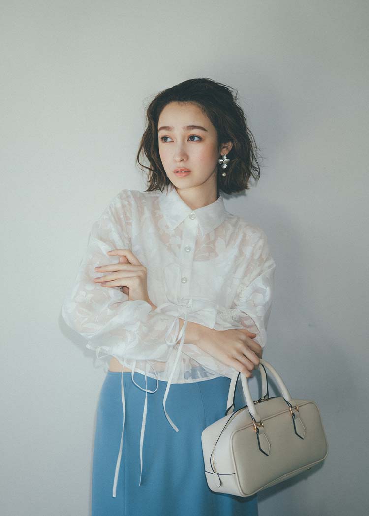 うっすらと肌が透けるレース素材が魅力的なブラウスは