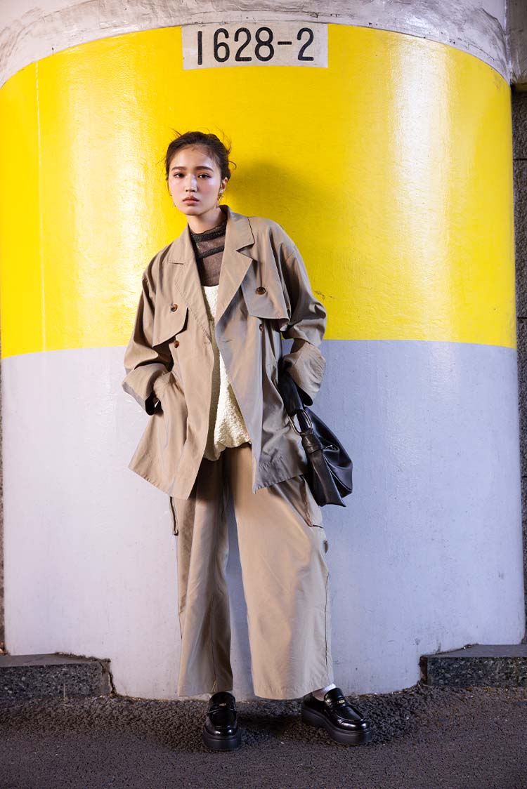 春定番のベージュトレンチには、イエローの投入がぴったり。