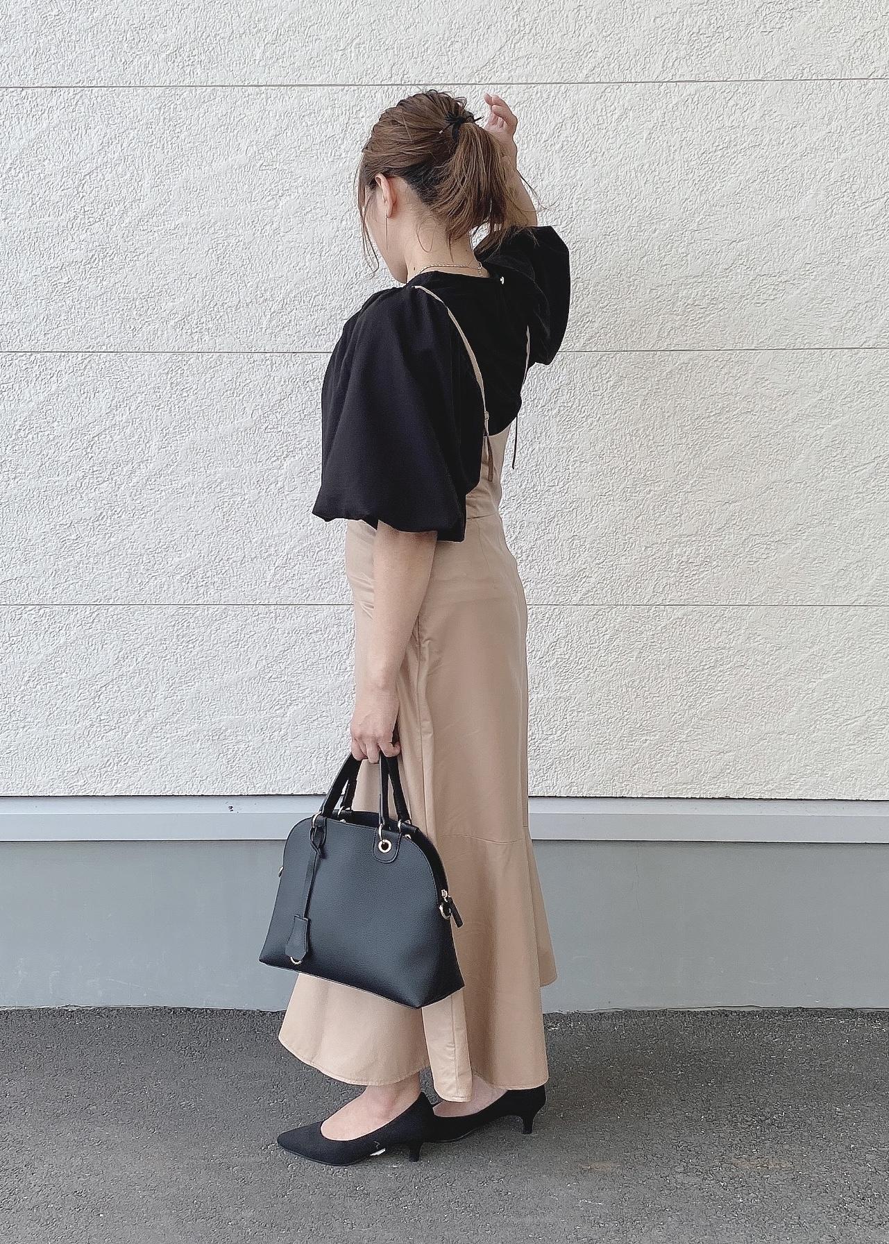 モノトーンコーデですが、トップスのお袖のボリュームがポイントとなり華やかさをプラスしてくれます!