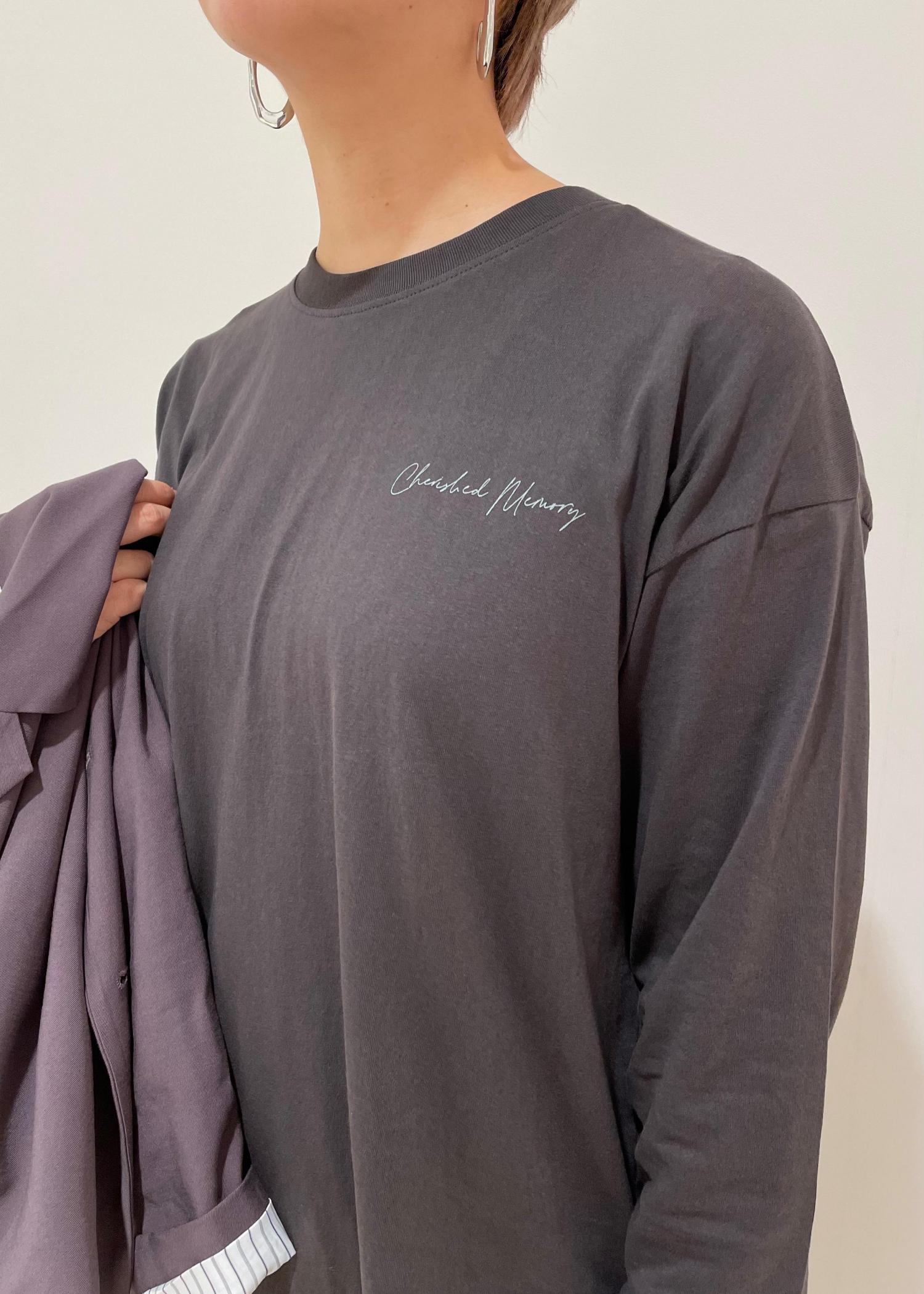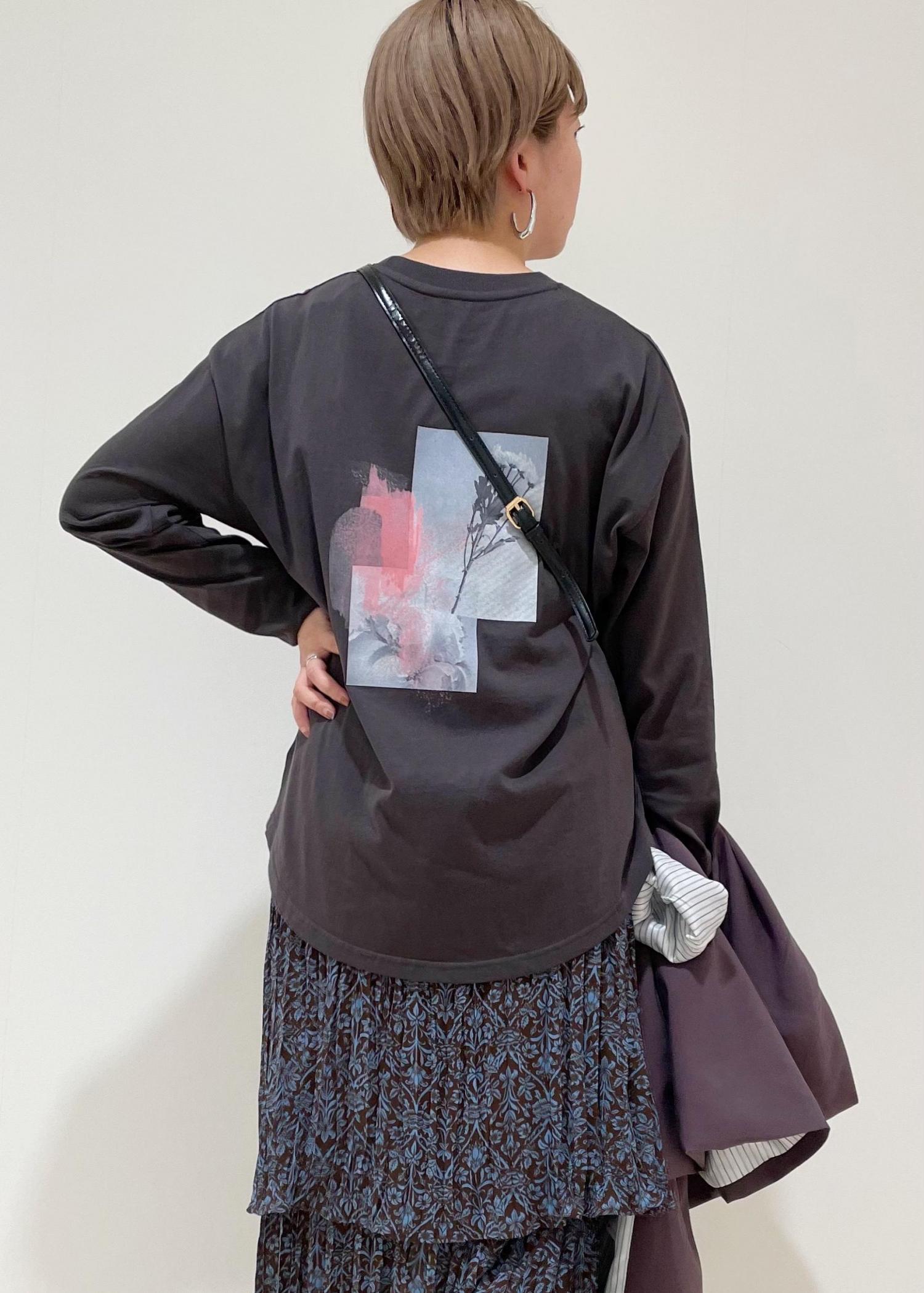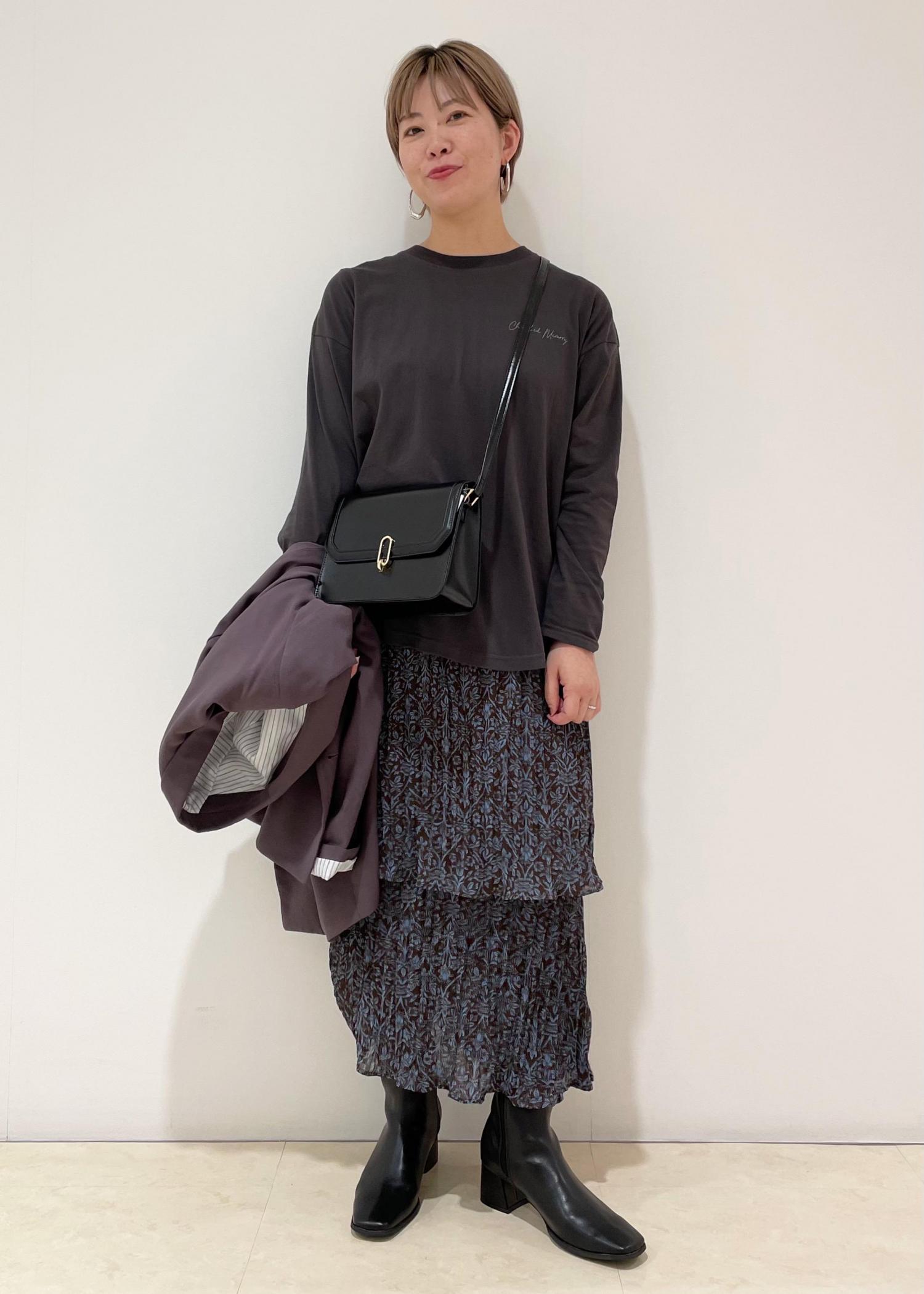 ロンT×スカートの軽めの着こなしに、ジャケットをラフに羽織ったスタイリング