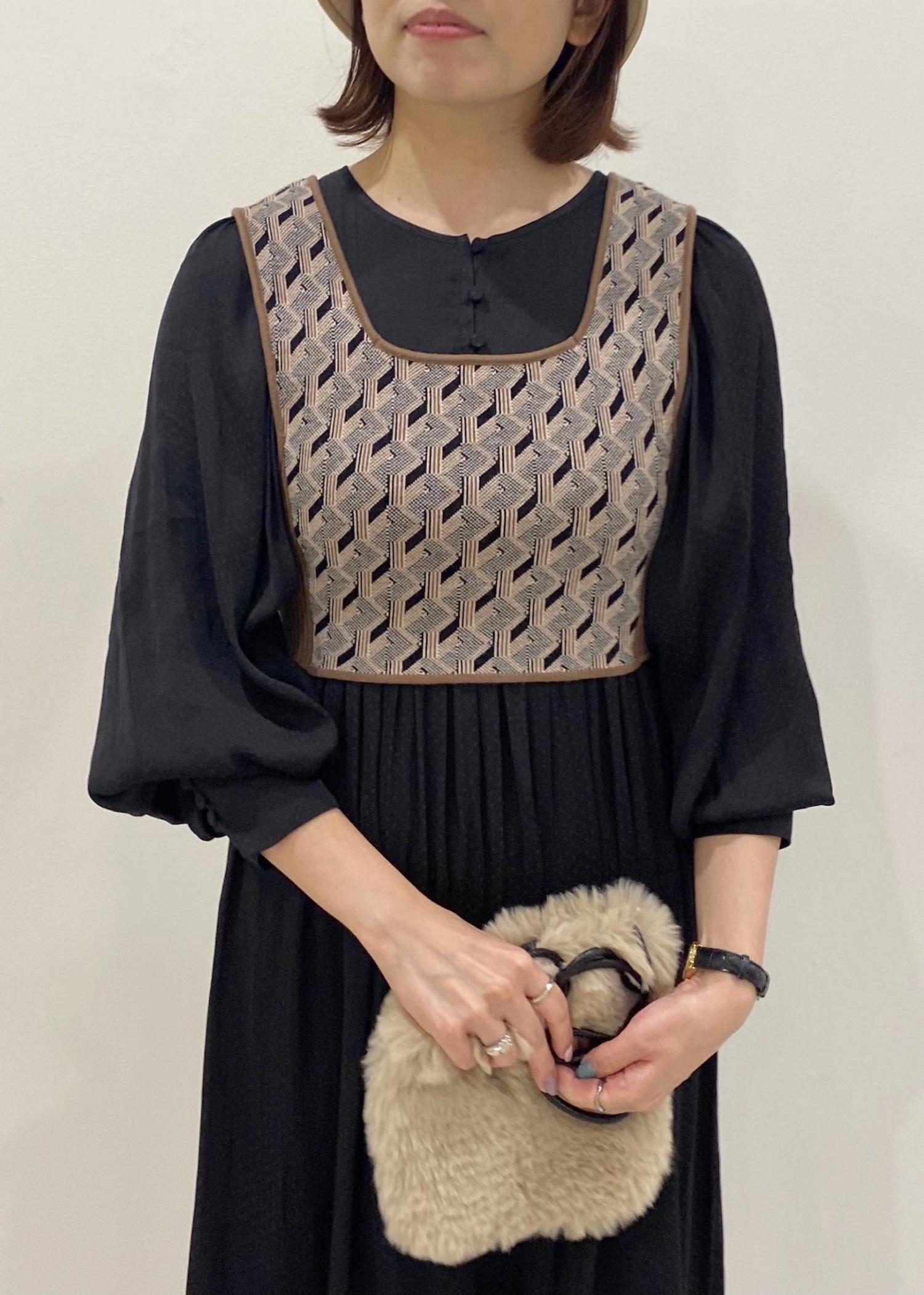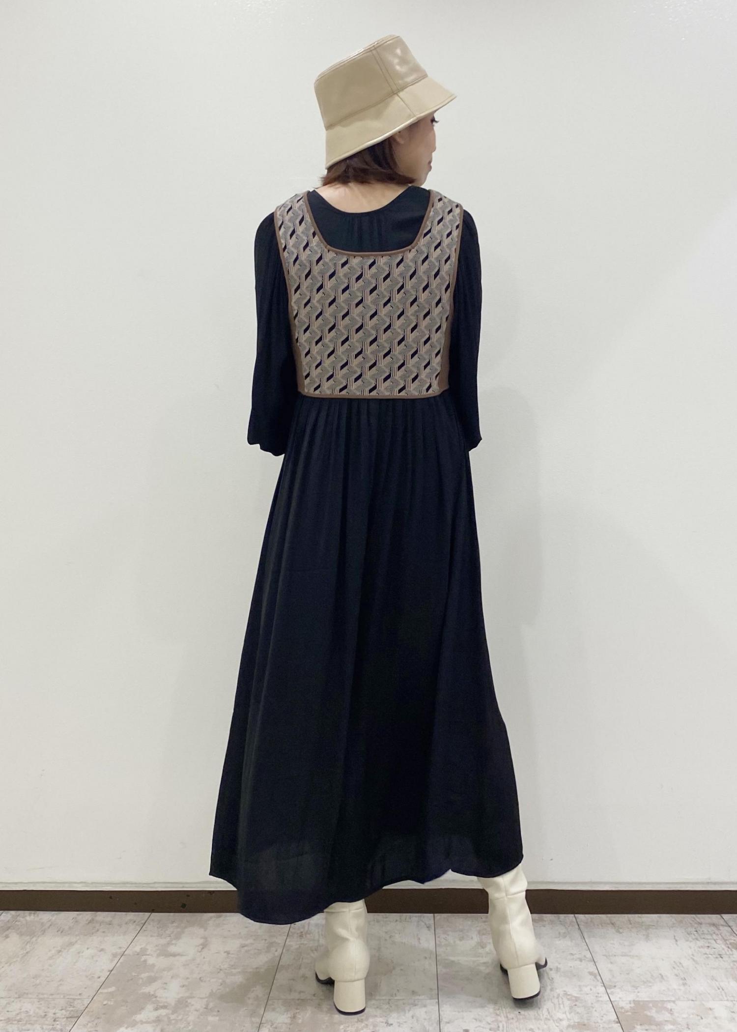 艶感のある黒のサテンジャガード素材のワンピースは