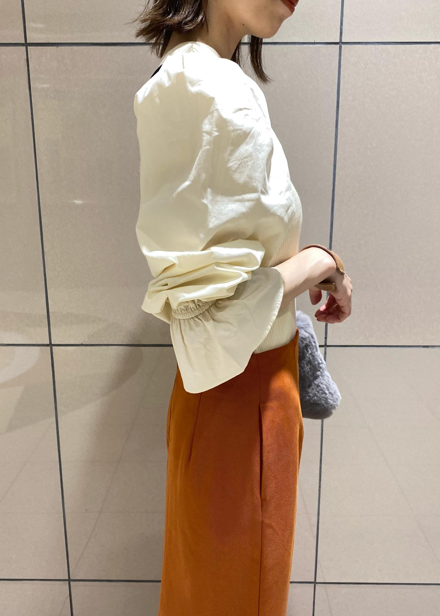 全体的に柔らかいイメージにしたかったので、トップスにはお袖がふんわりとしたキナリのトップスを選びました。