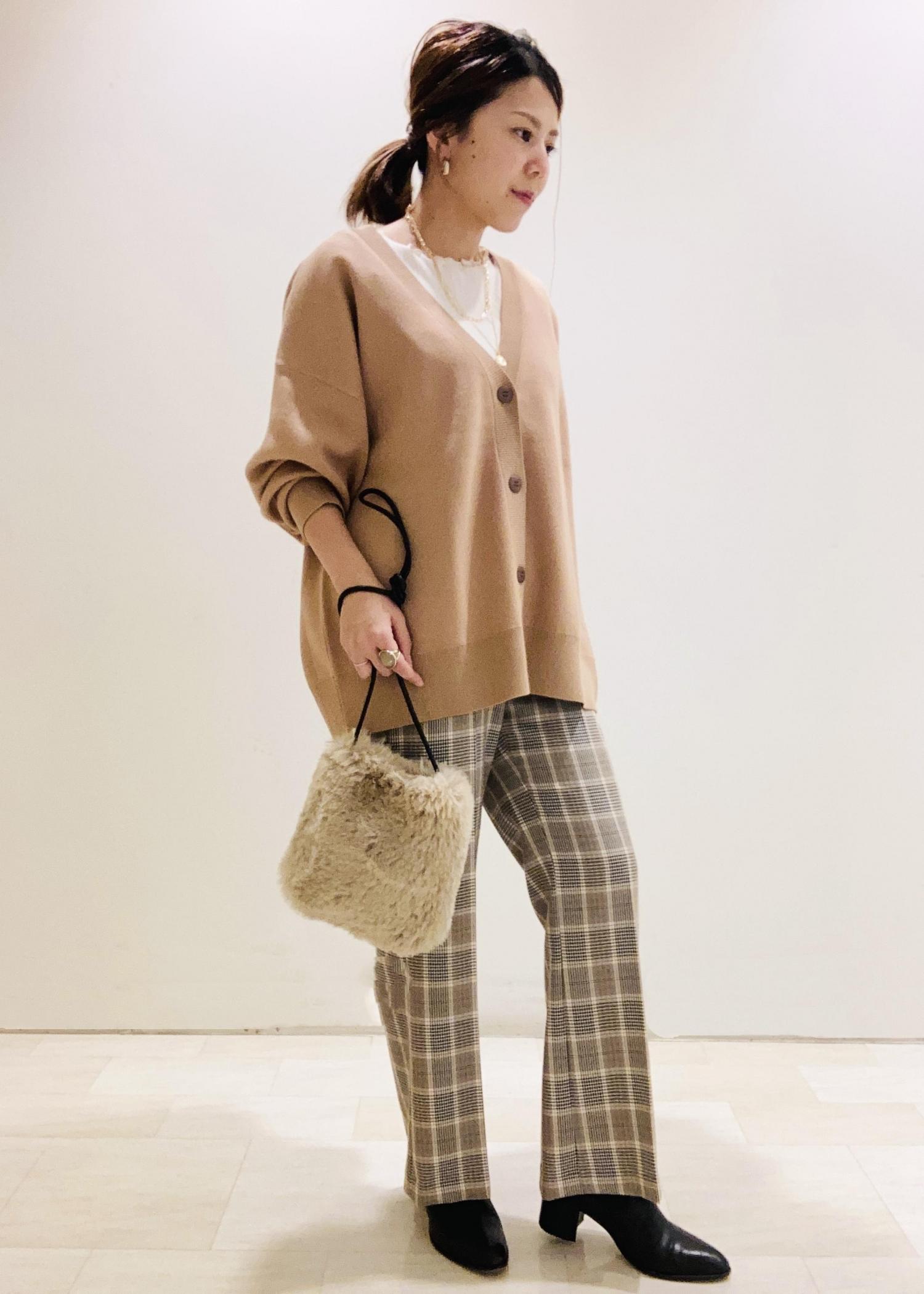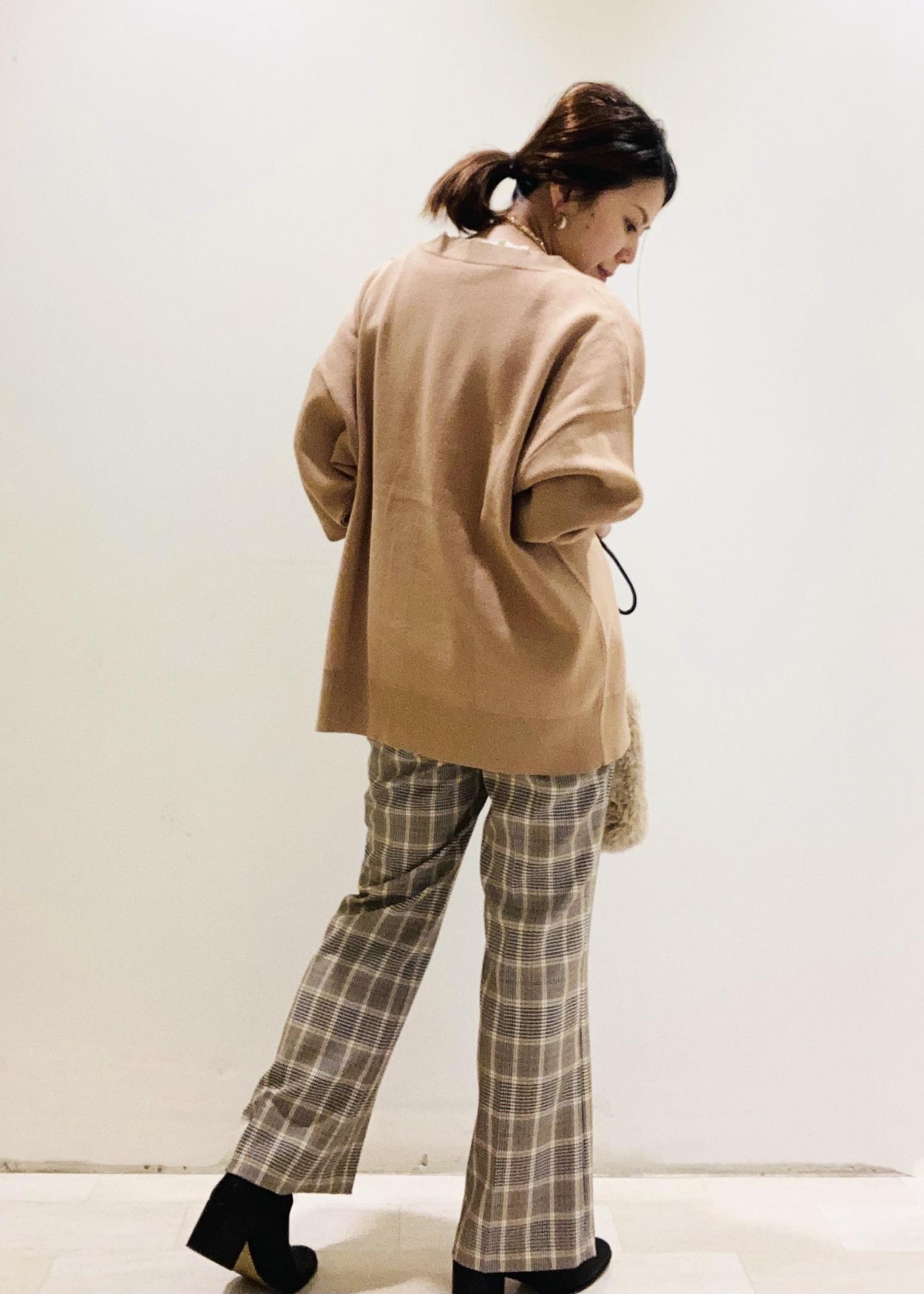 ビッグシルエットカーディガンと合わせてラフなスタイリングなのでショートブーツを合わせてパンツのキレイなラインを出し、カッコ良さをプラスしました。
