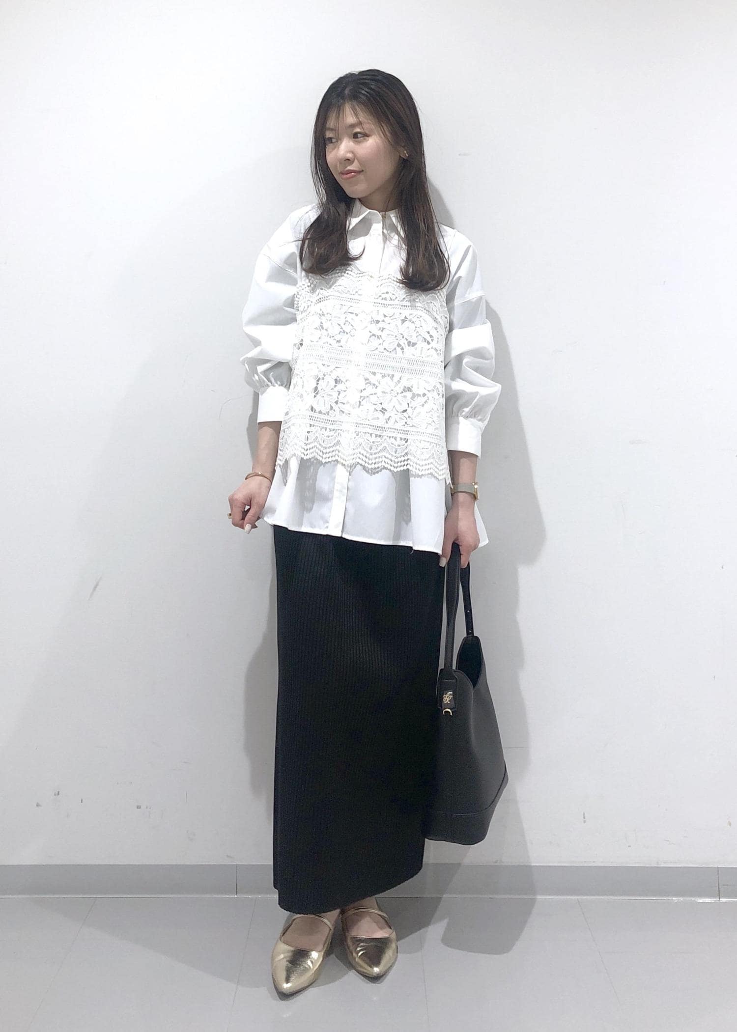 全体がモノトーンのため、グリーンのバッグがアクセントになっています。