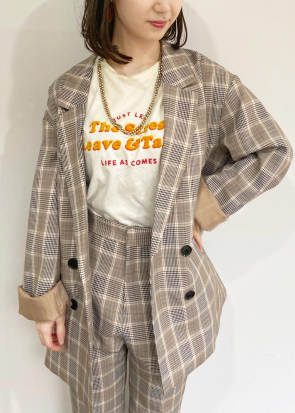 チェック柄のセットアップはロゴTと合わせて、レトロなコーディネートに。
