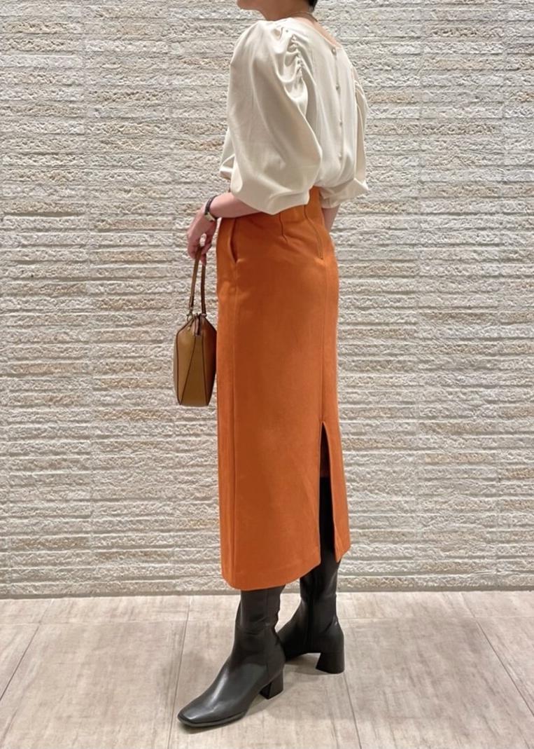 袖のボリュームも今年らしいふんわり感なのでタイトスカートを合わせました。