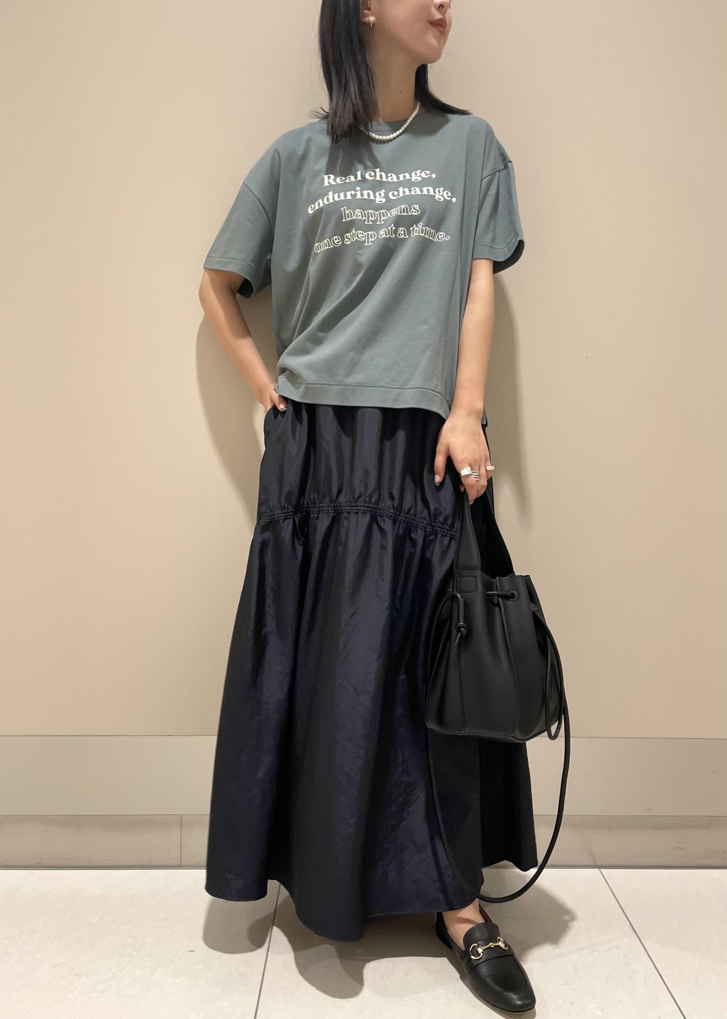グリーン×ブラックで秋カラーを意識し、カーディガンのインナーはTシャツを合わせることでジャストで着られるコーディネートにしました♪