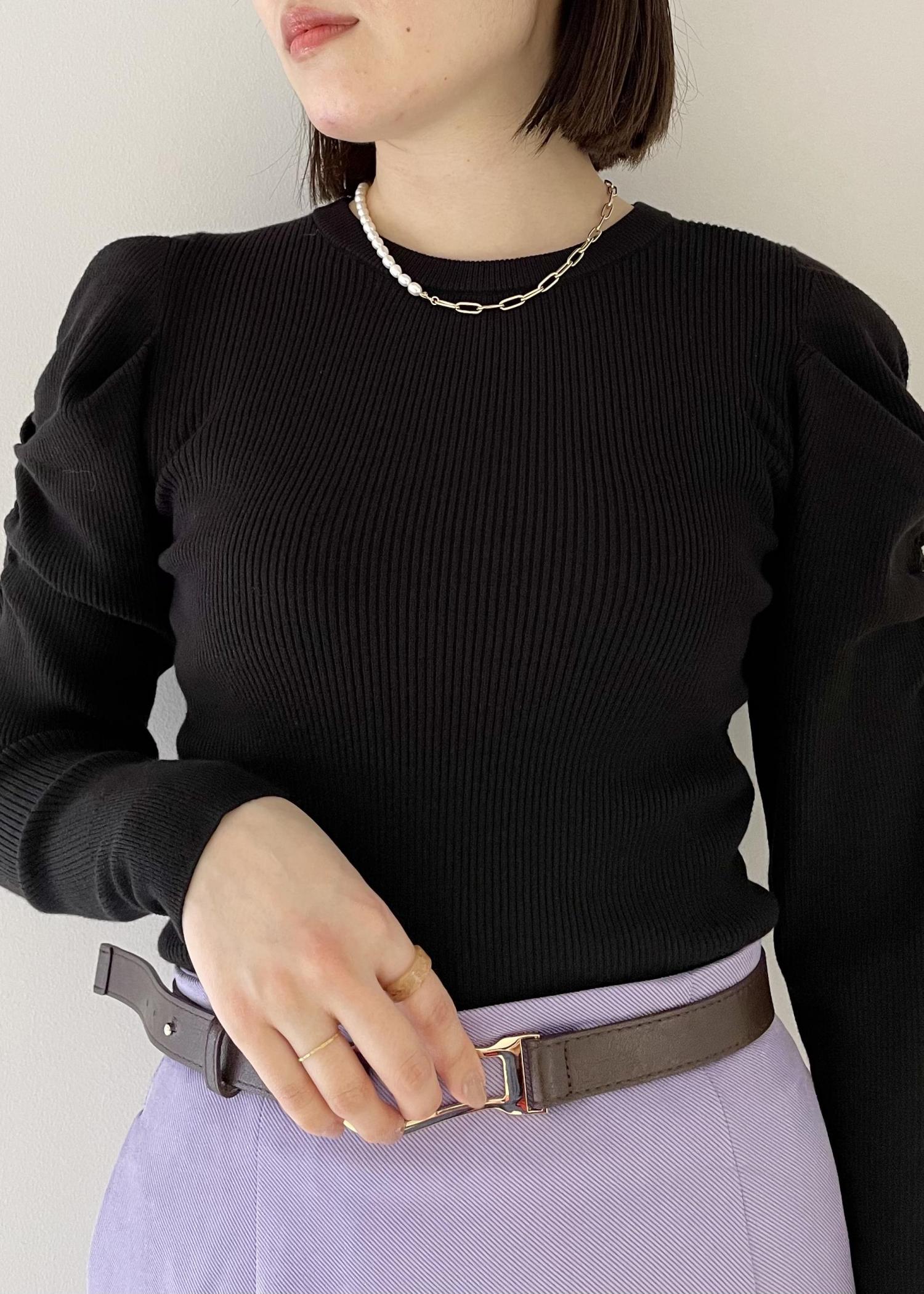 綺麗なパープルが目を引くタイトスカートを引き立たせるためブラックのニットで合わせてみました♡