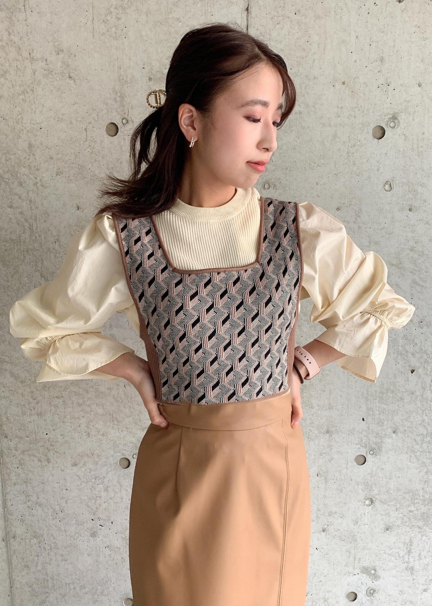 インナーのトップスは袖にボリュームがありますが、身頃がスッキリしているのでバランスが取りやすく、どんなボトムスとも合わせやすい◎