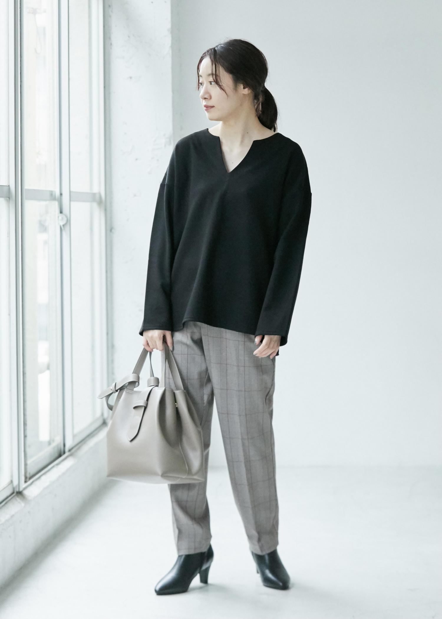 キーネックトップスと、チェックのテーパードパンツで合わせたスタイリングです。