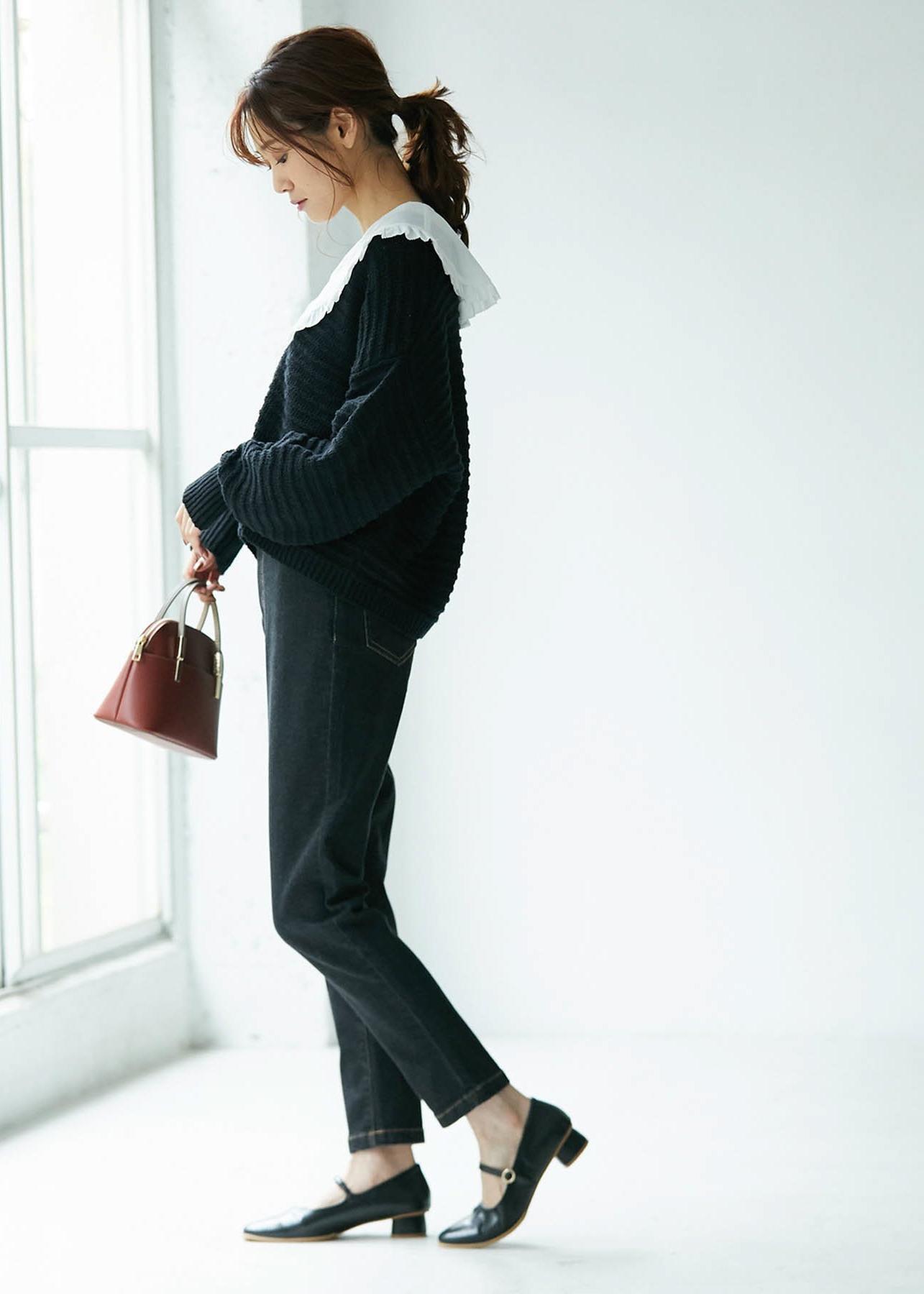 トレンドのビックカラーブラウスを生かすためにモノトーンにしました。