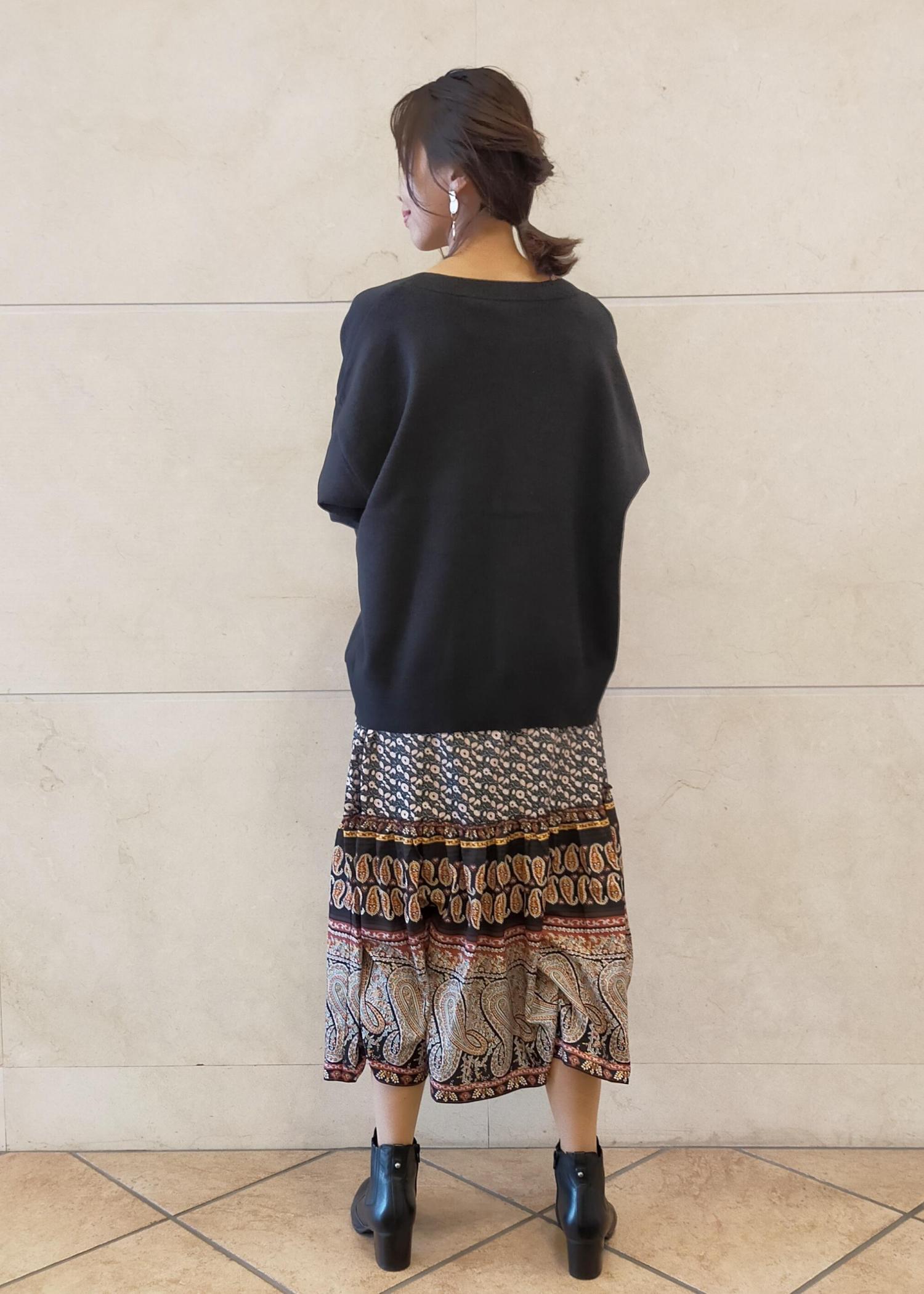 柄ワンピースに黒のカーディガンを足す事で、少し落ち着いた印象に仕上げました。