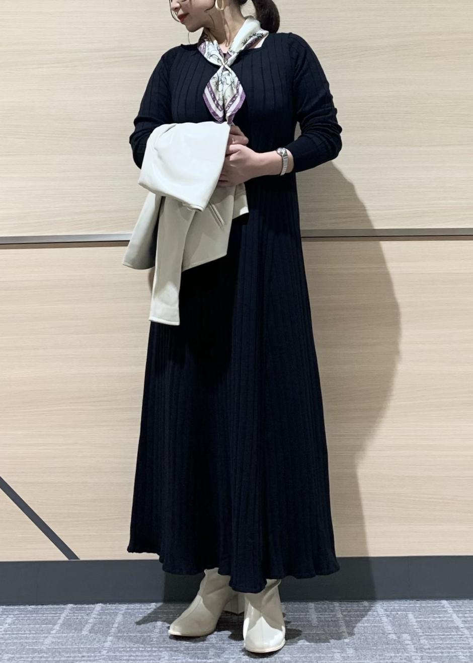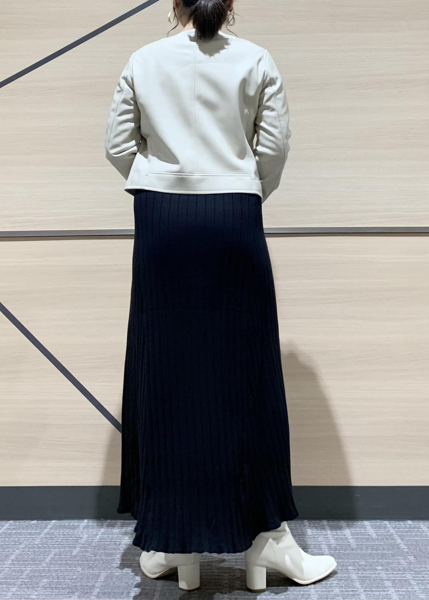 オーガニックコットンを使用したチクチク感のない着心地の良いニットワンピースと、ノーカラーデザインのフェイクレザージャケットです。