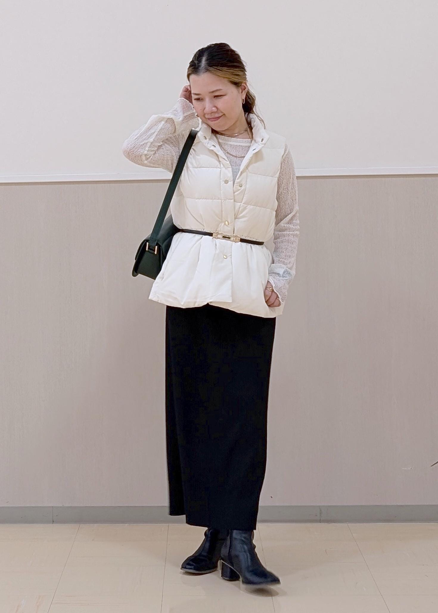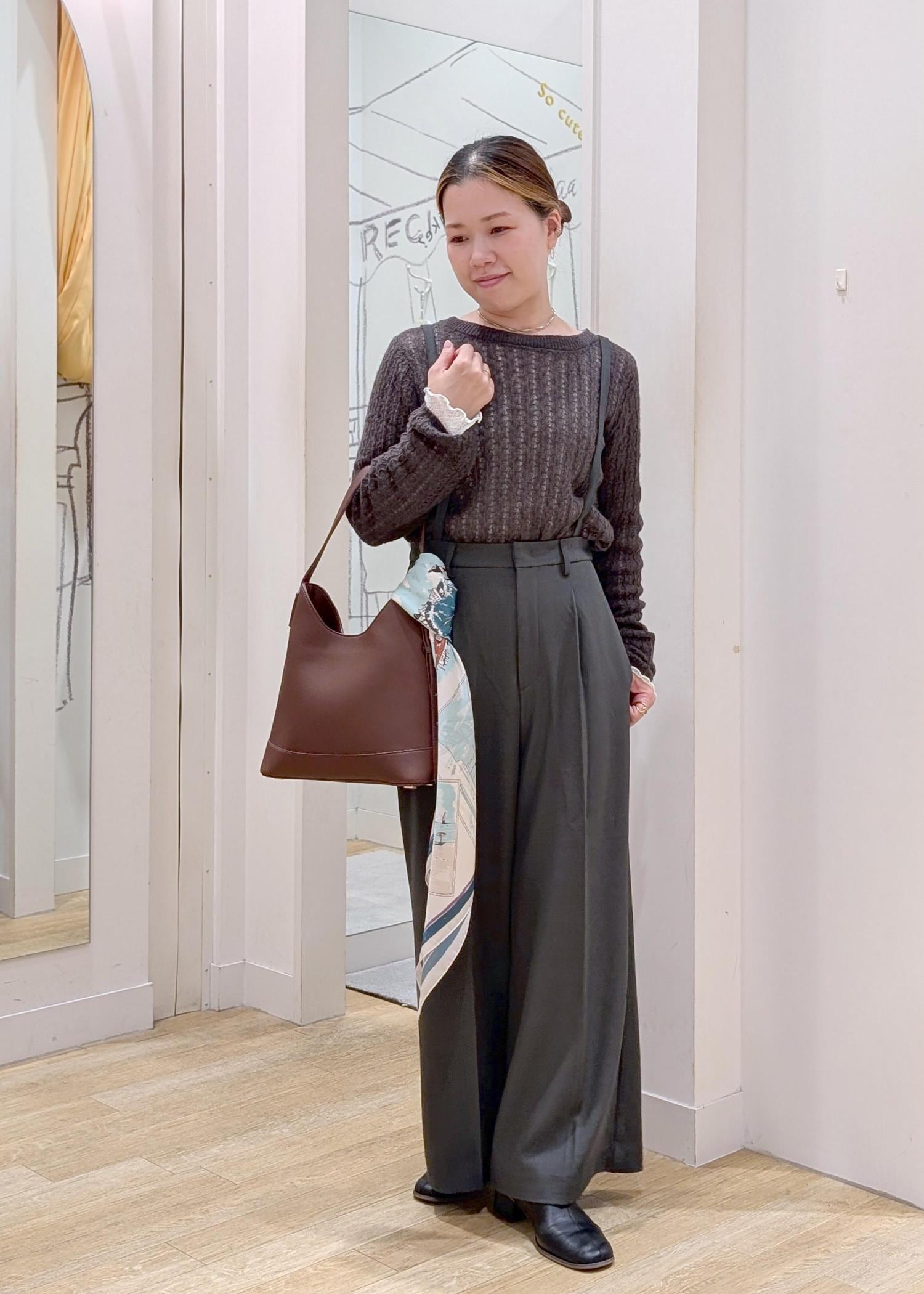 アクセントとしてバッグとパンプスに色味を持ってきました
