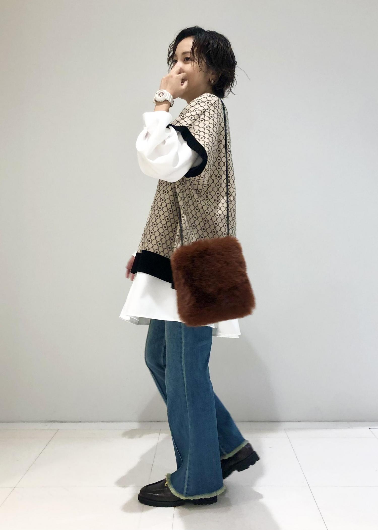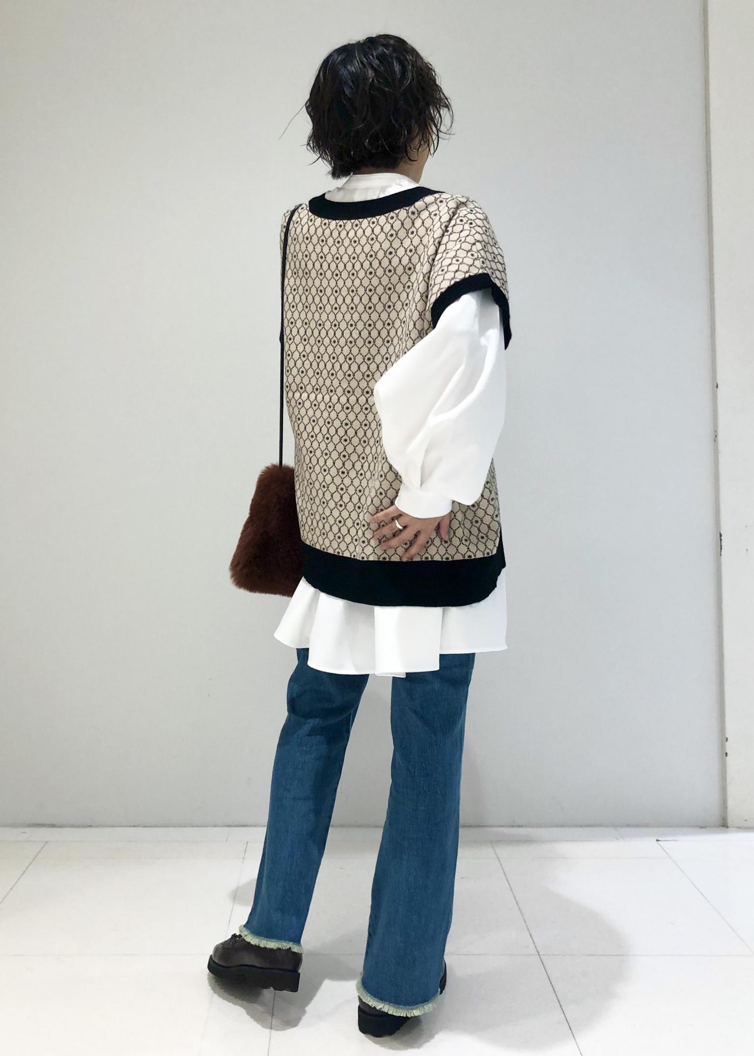 ニットベストよりもビッグシルエットなブラウスと合わせ
