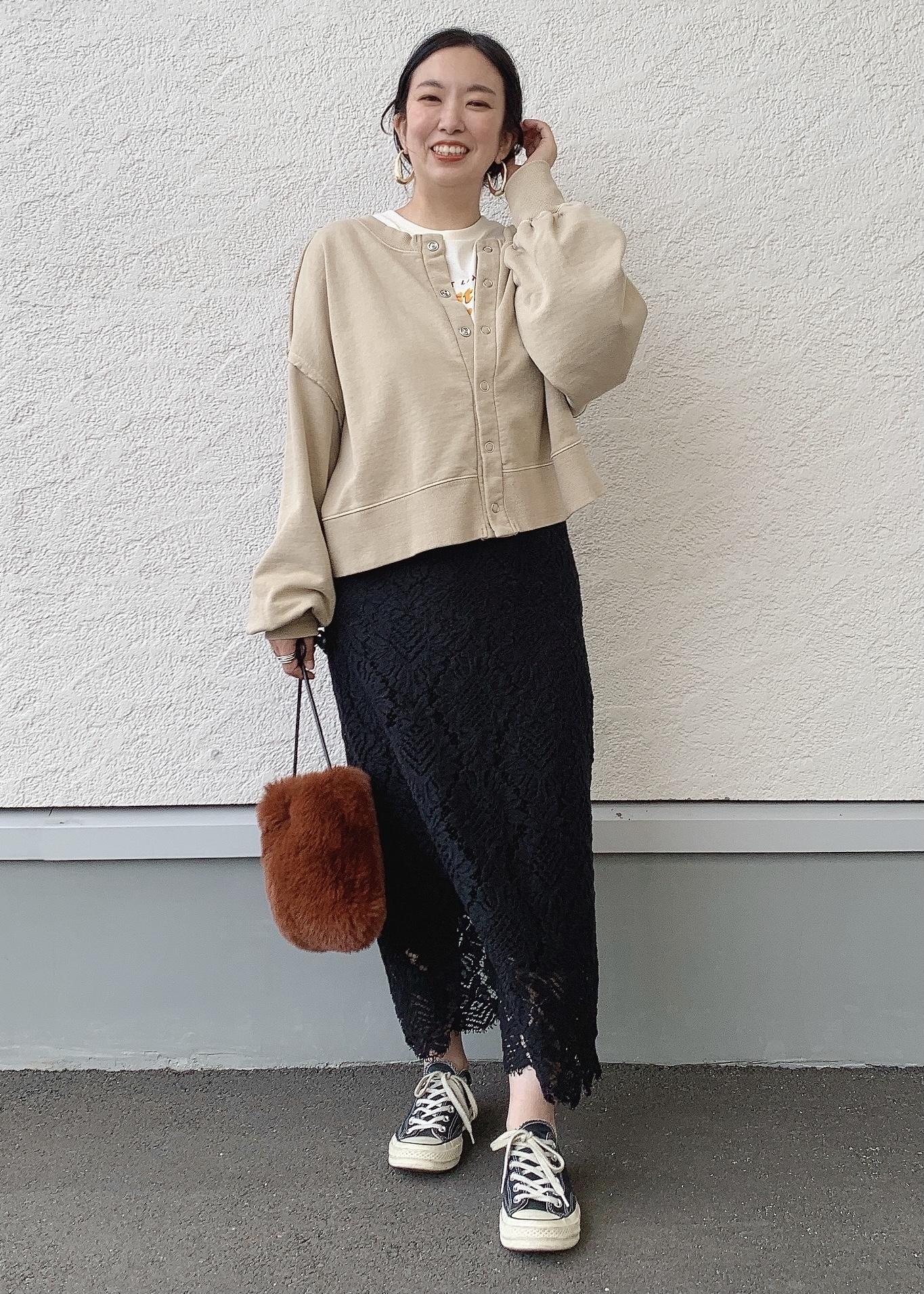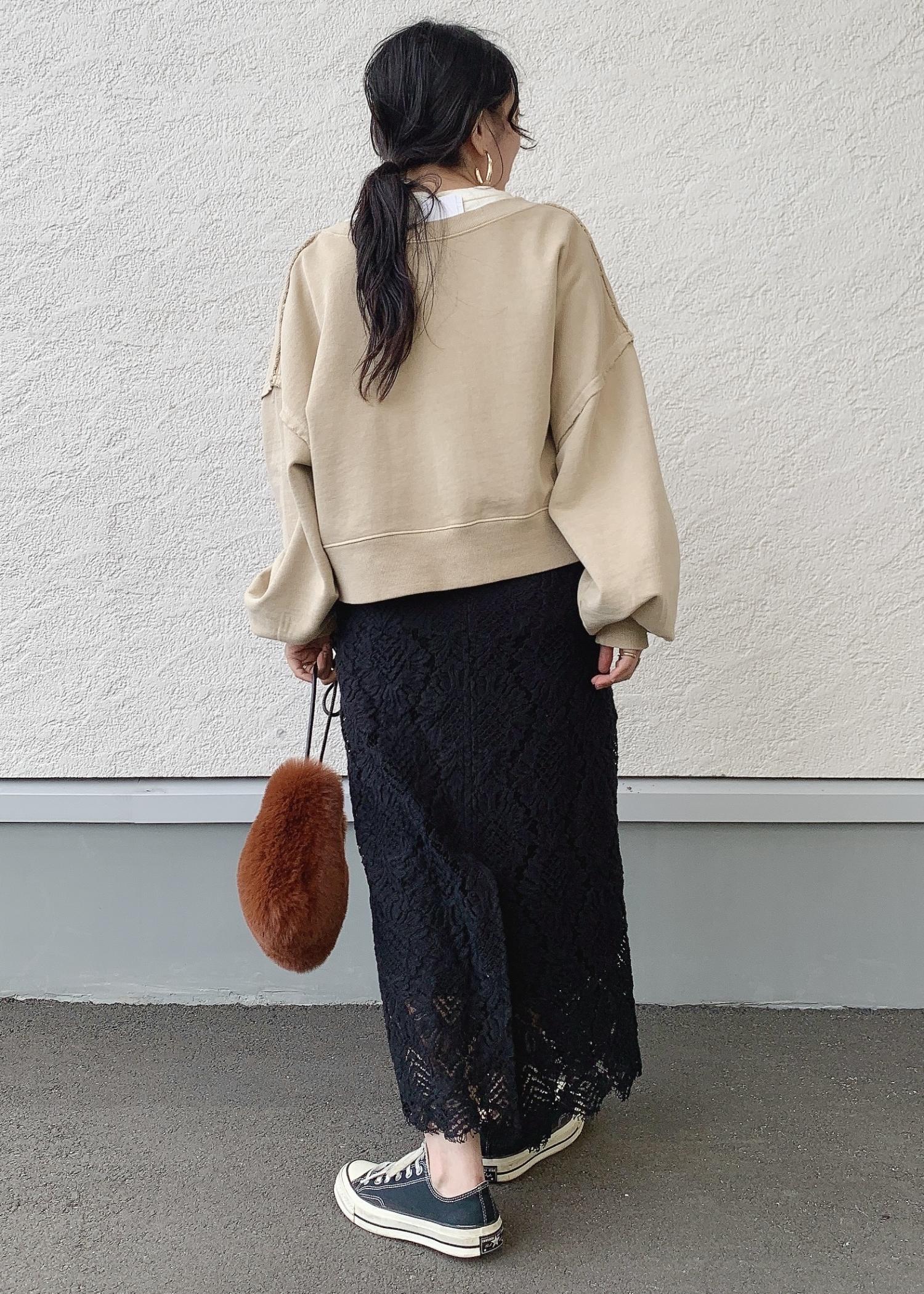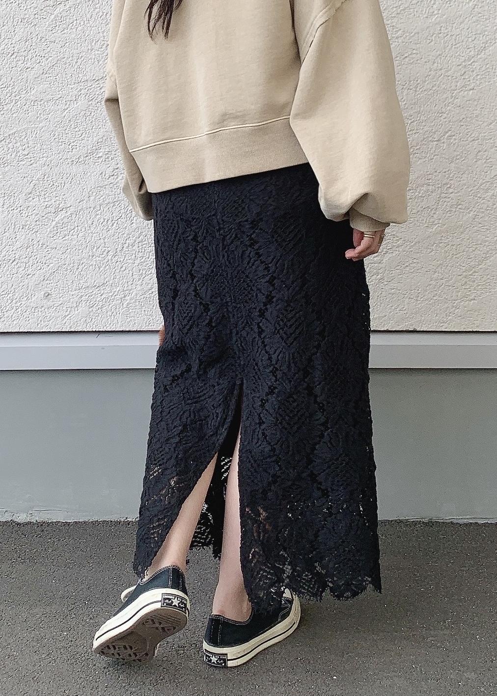 Tシャツ、スウェット、スニーカーとカジュアルなアイテムの中にレースで華やかさを。