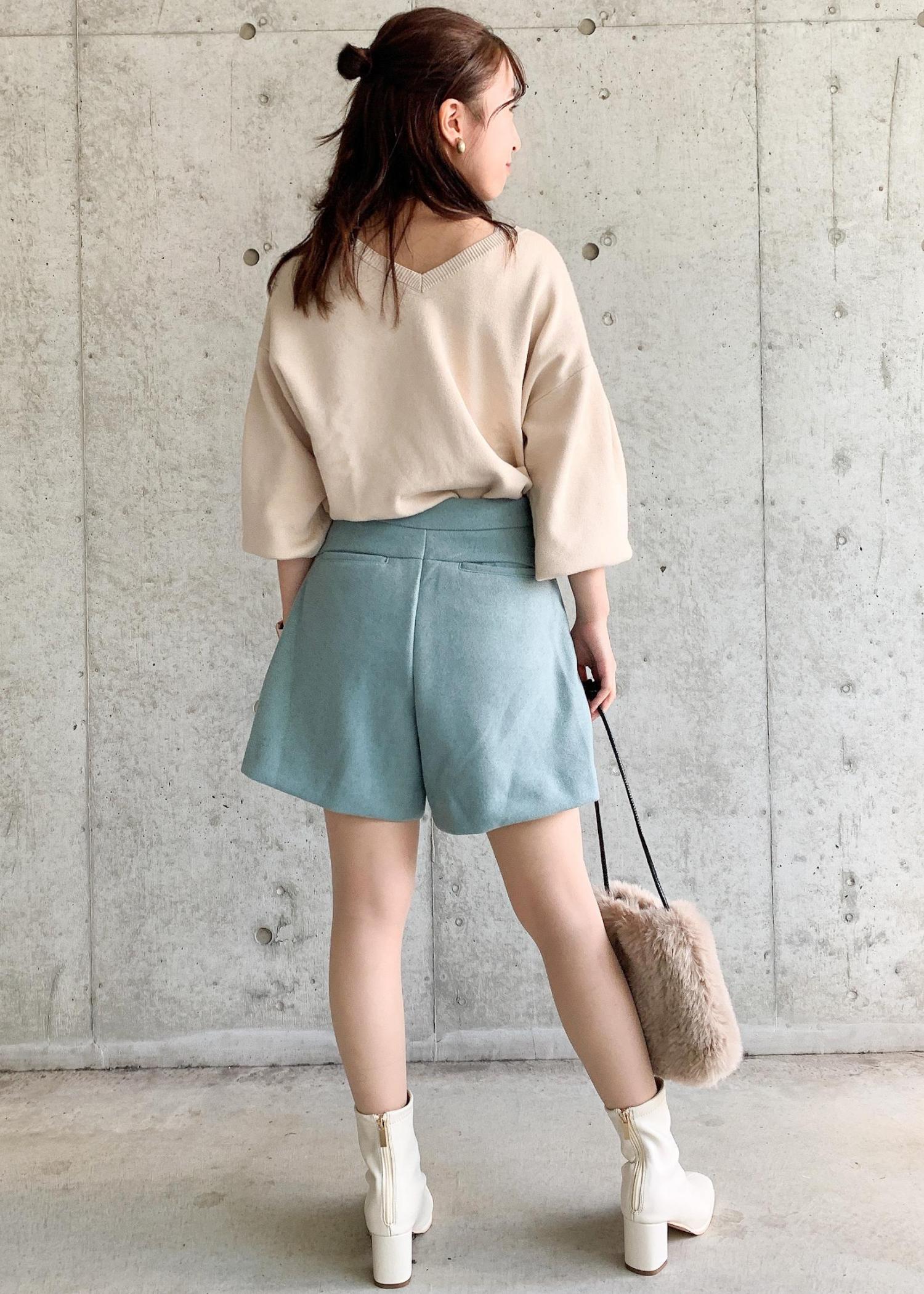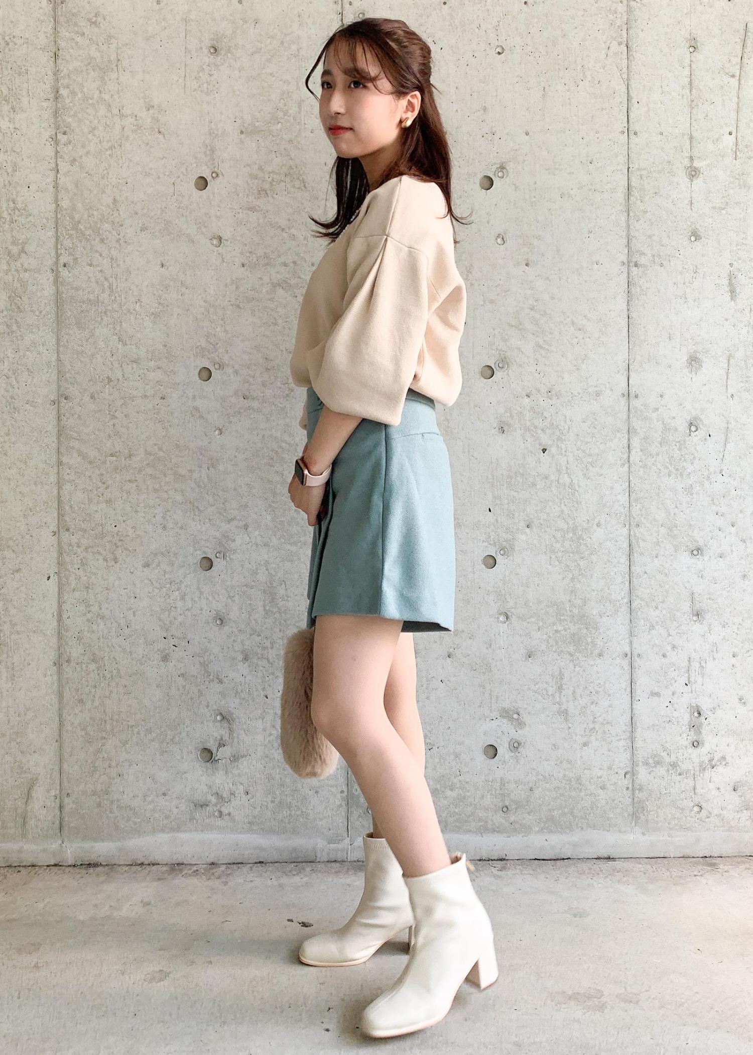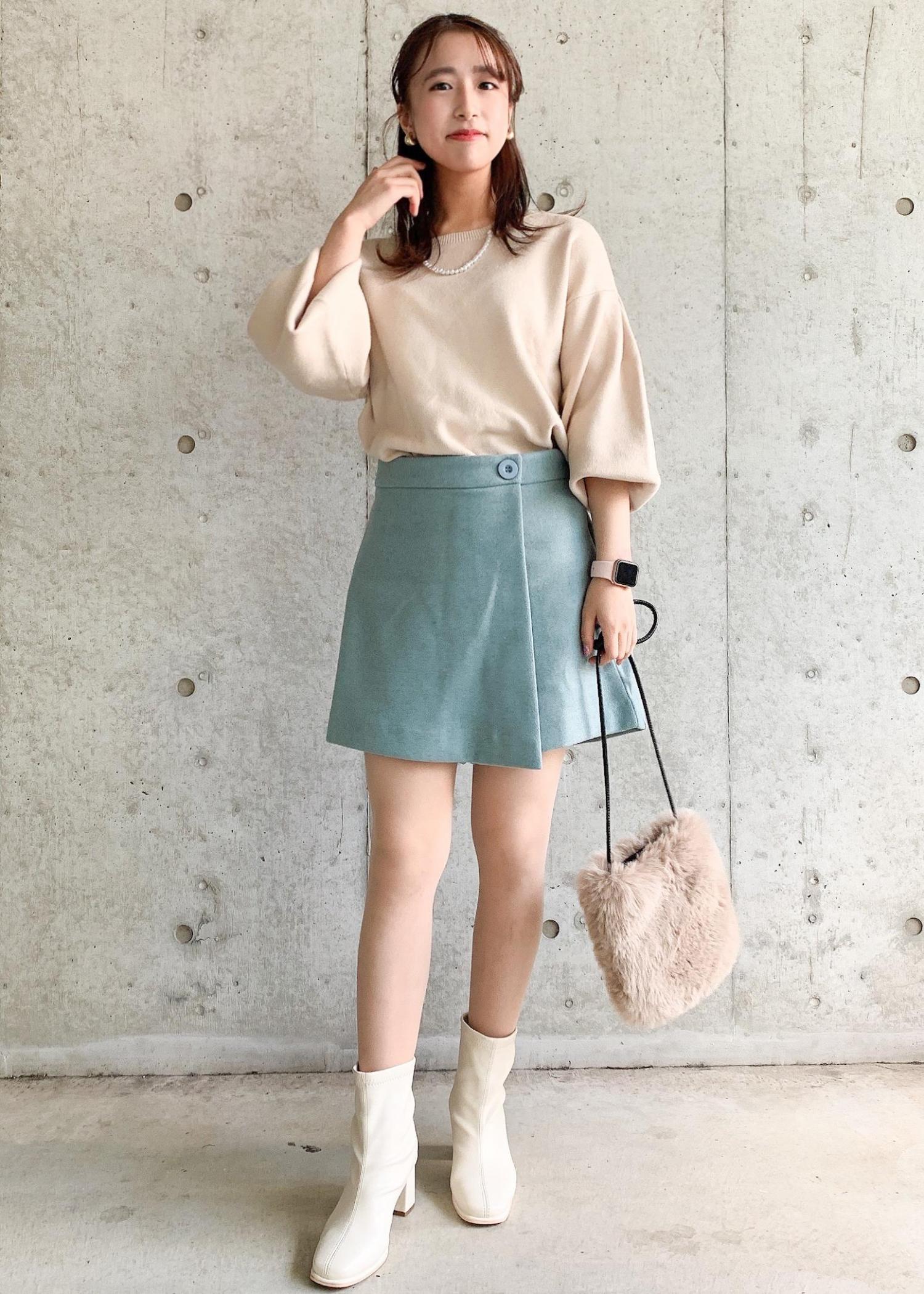 袖のボリュームがかわいいニットと、ミニ丈のラップスカート風ショートパンツを合わせて秋冬ホワイトコーデにしました。