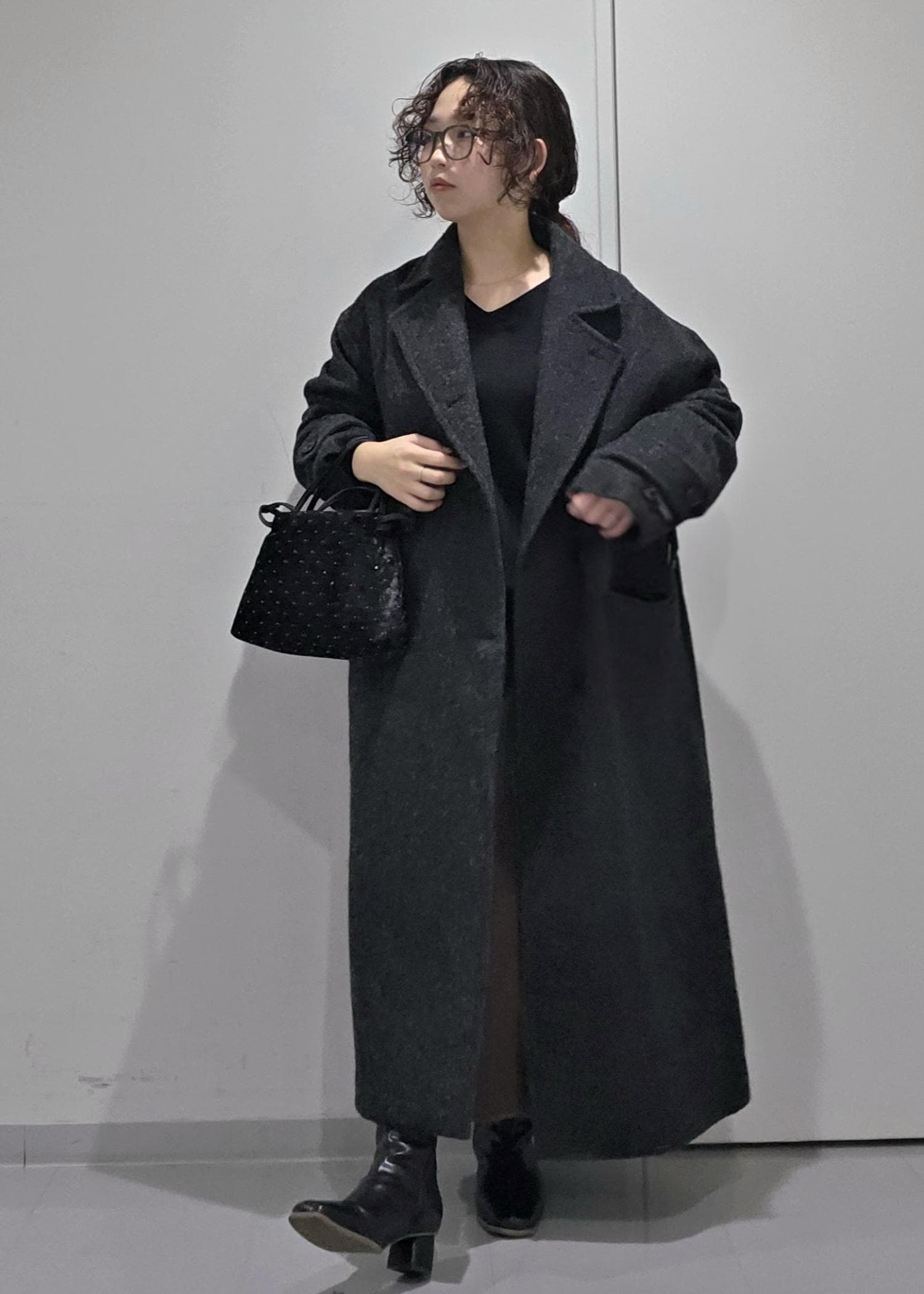 きちんと感の出るツイード素材セットアップをごつめのブーツやTシャツと合わせてカジュアルダウンしたスタイリングです。