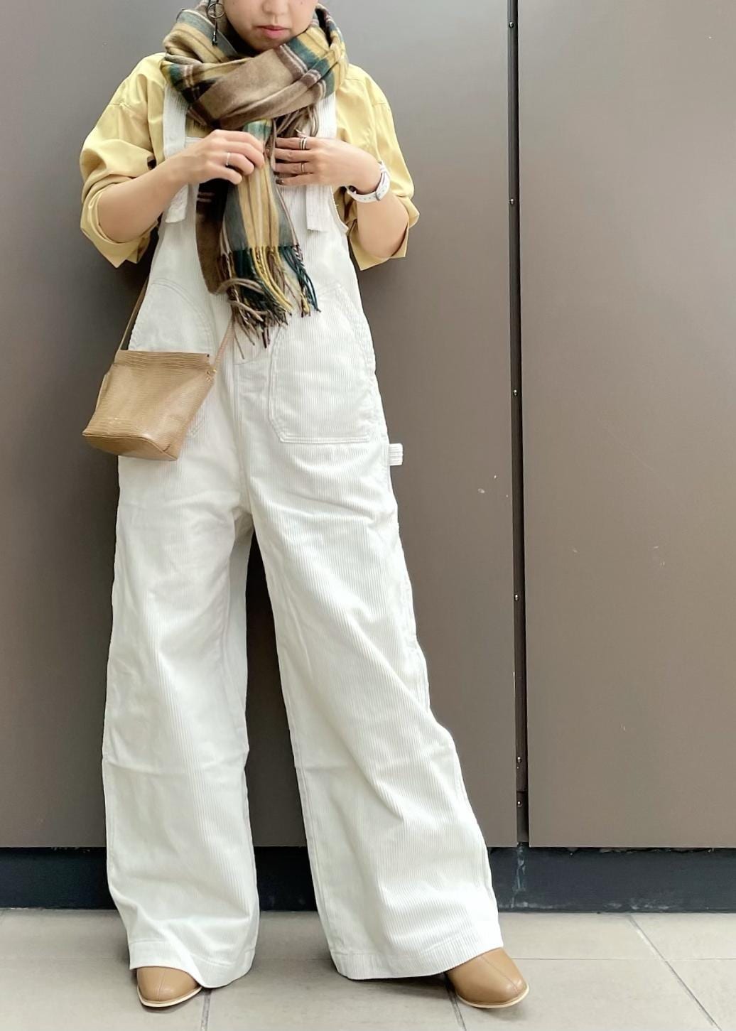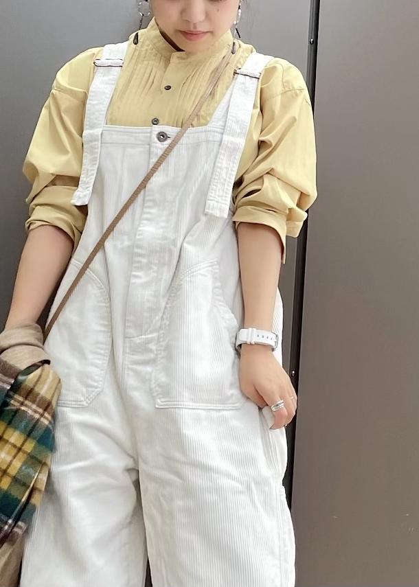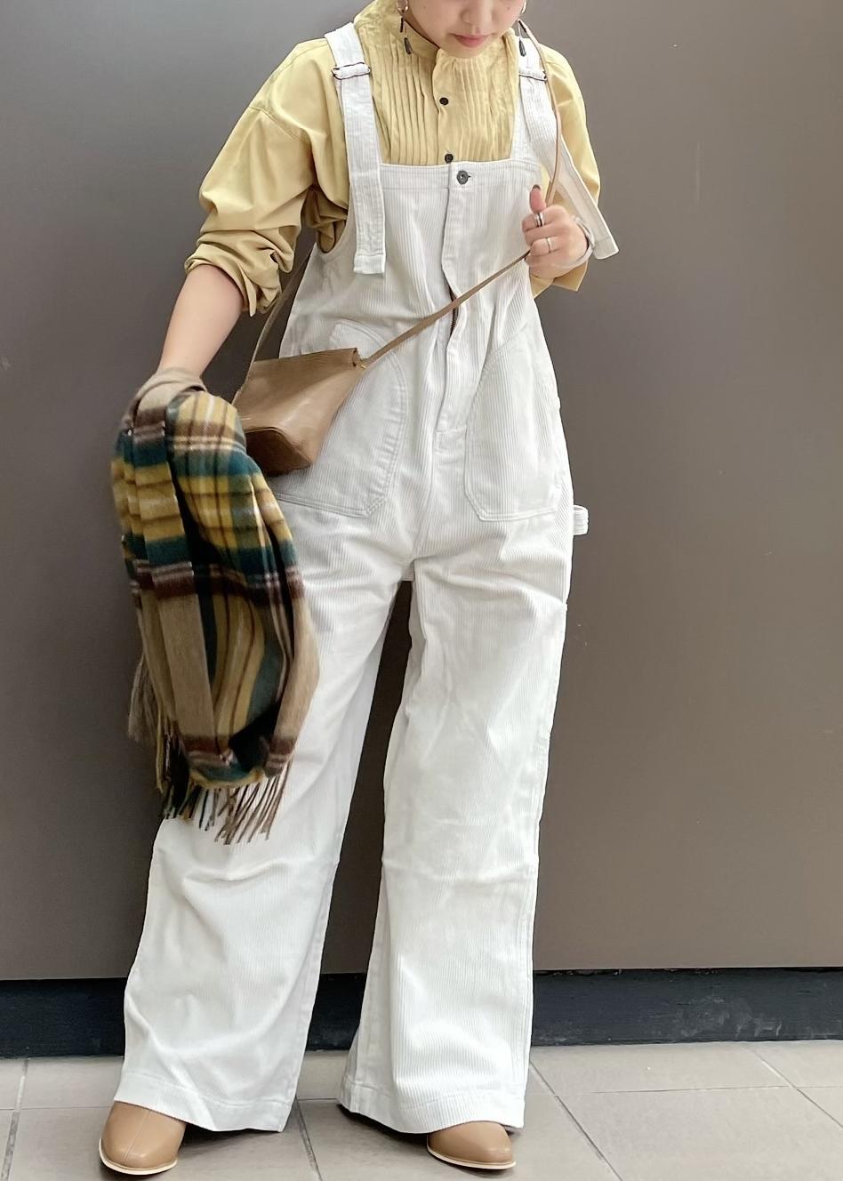 コーデュロイのオーバーオールにイエローをプラスして明るい印象の秋コーデにしました!