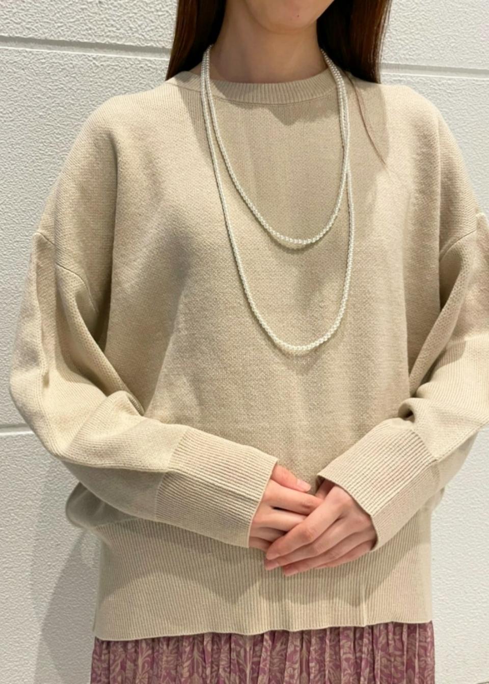 ゆったりシンプルなニットには、デザイン性のあるスカートとパールのネックレスを合わせ女性らしい華やかなコーディネートにしました。