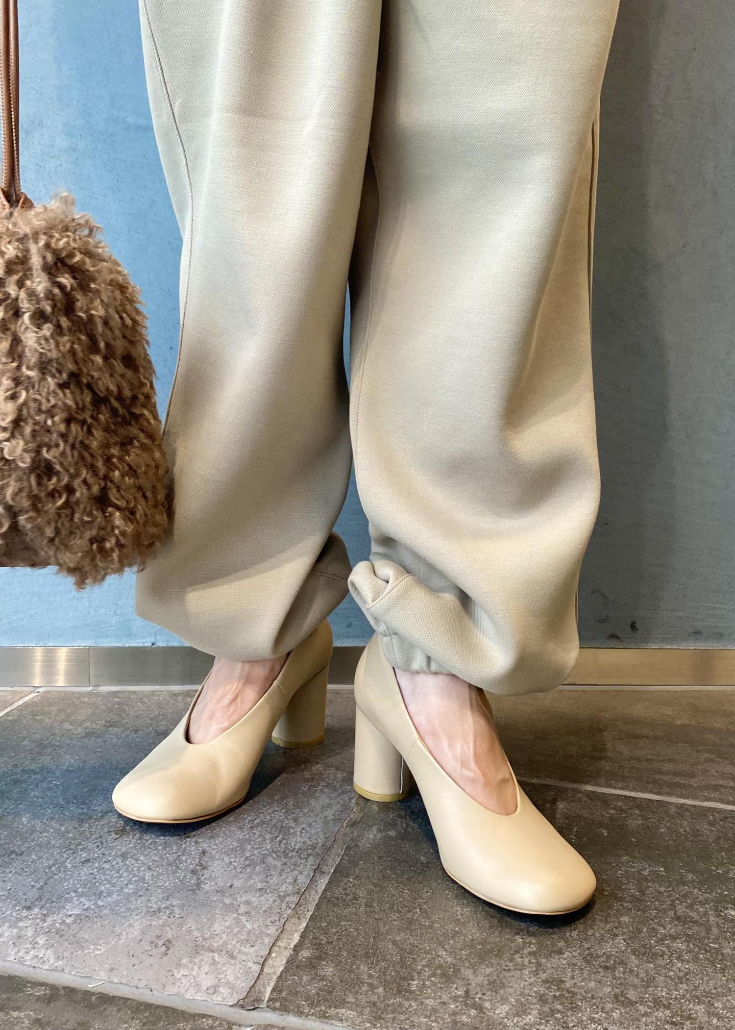 ただカジュアルなだけだとだらしなくなってしまうので、スウェットはハリのあるダンボール素材、高めのヒールや落ち着いたトーンのベージュカラーを合わせて上品さ忘れずに。