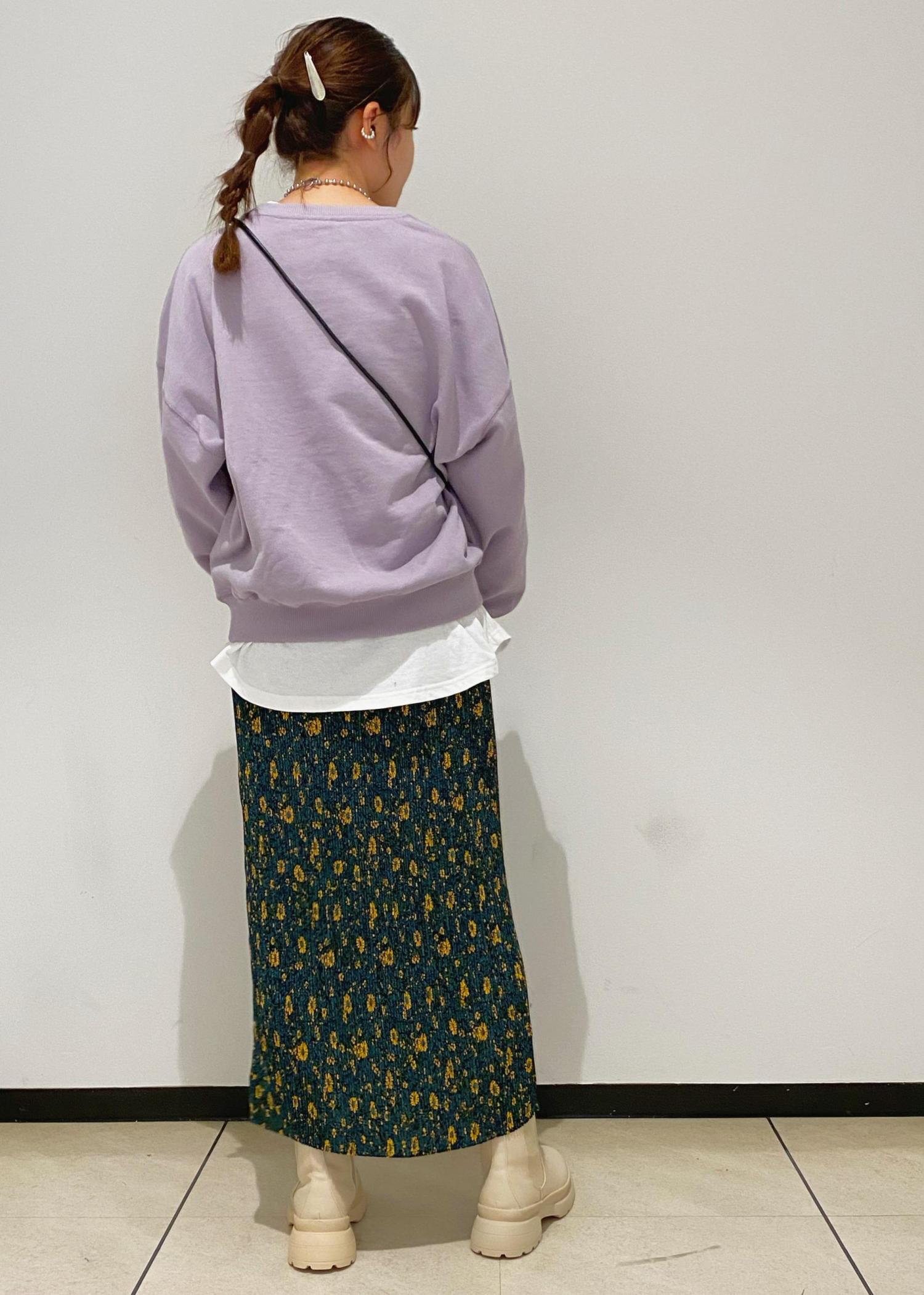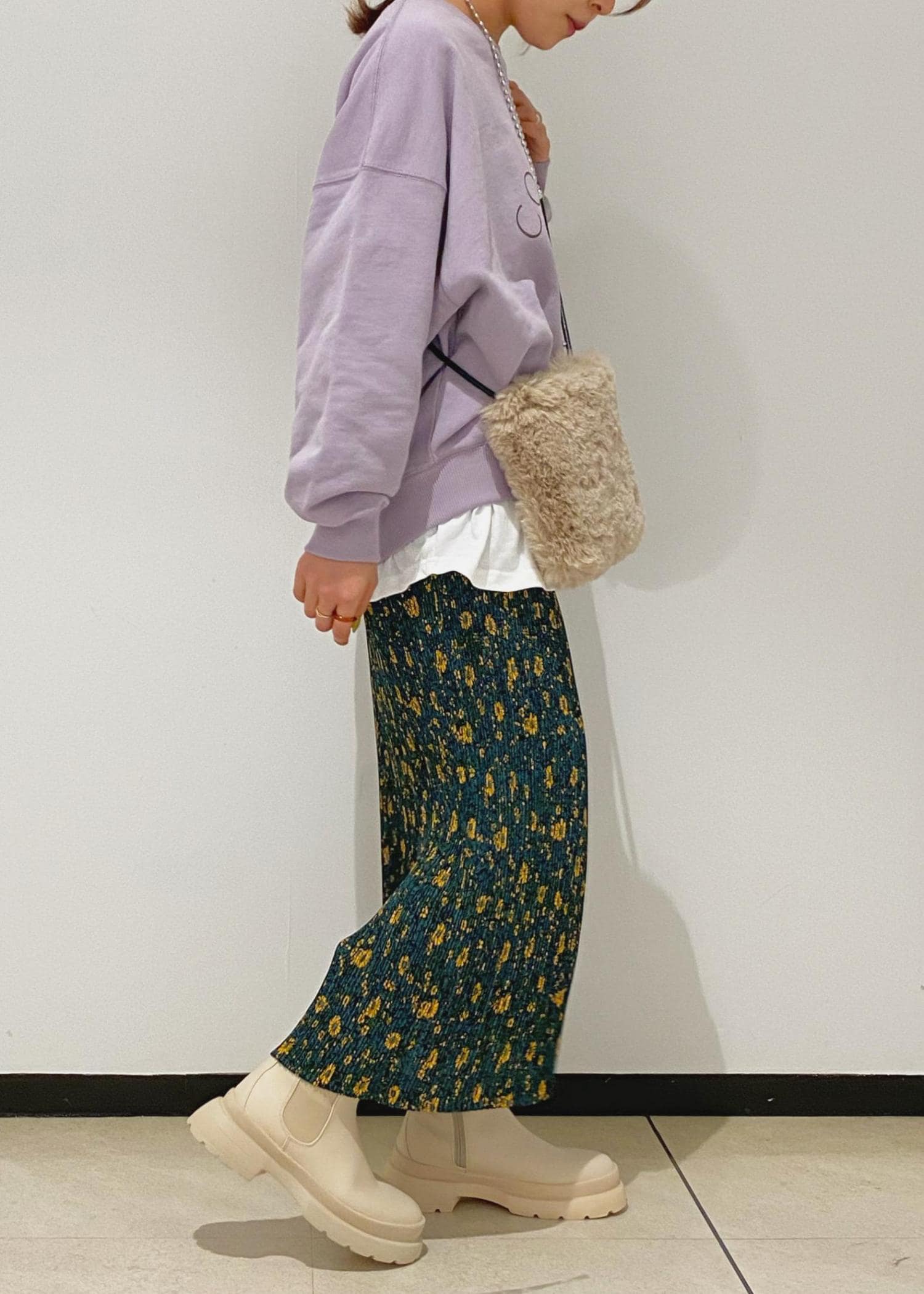深みのある落ち着いたグリーンに淡い優しいパープルを合わせて、カラー×カラーコーデにしてみました!