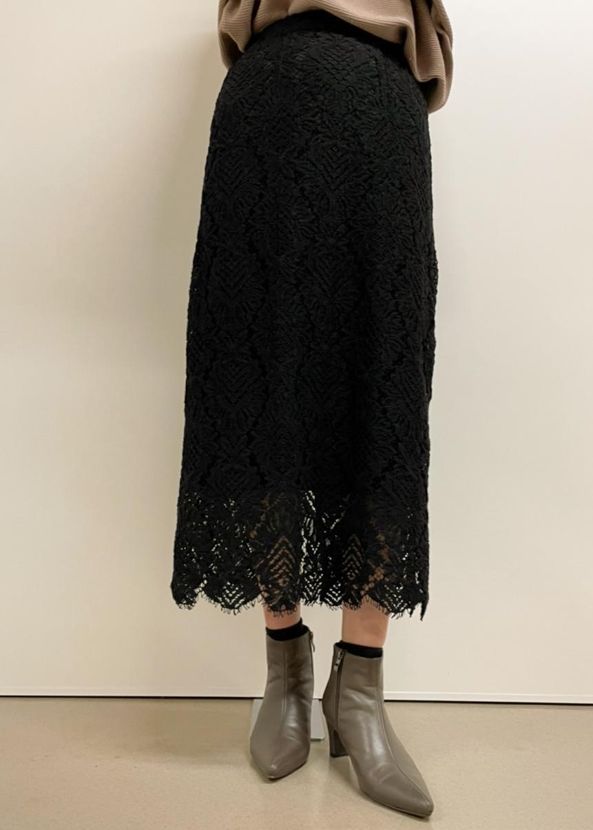 落ち着いたベージュ色のドルマンニットに黒のレーススカートを合わせた大人の女性らしい着こなしにしました。