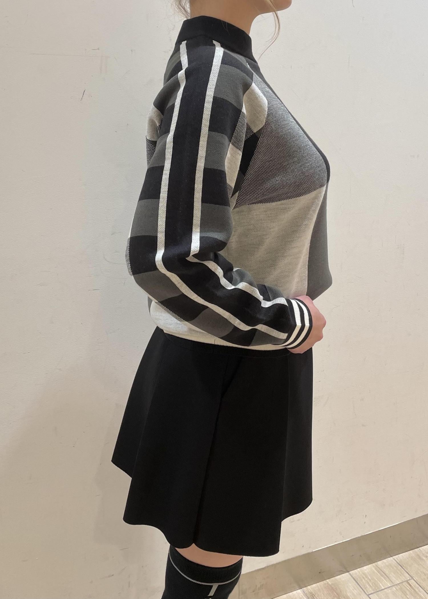 バッファローチェックのニットを主役にモノトーンでまとめたコーディネートは