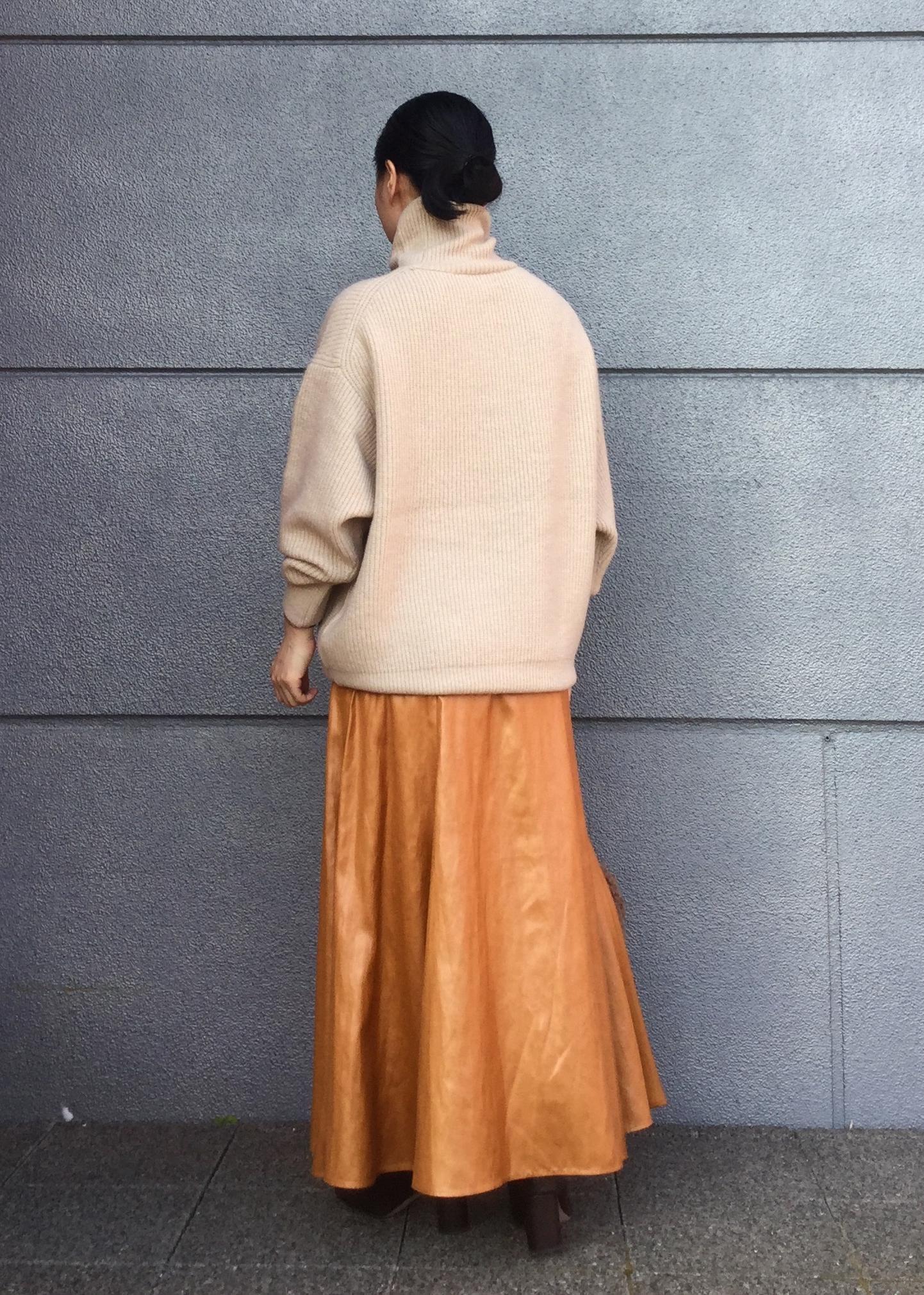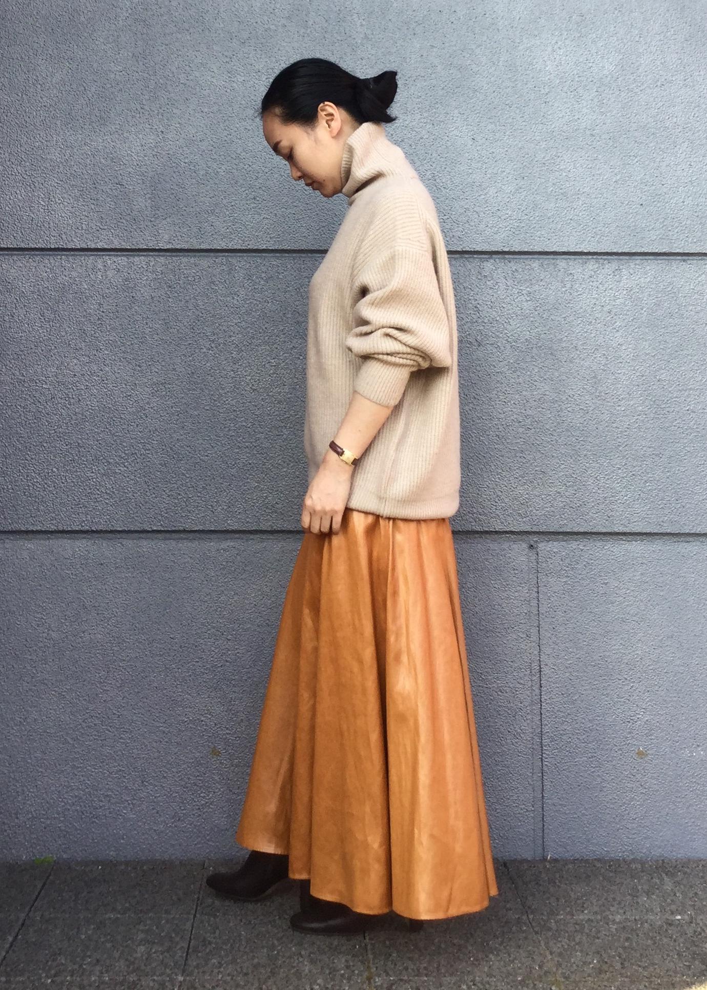 着用すると自然な丸みの出るシルエットで、サテンスカートなど女性らしいアイテムとの相性がとても良いです。