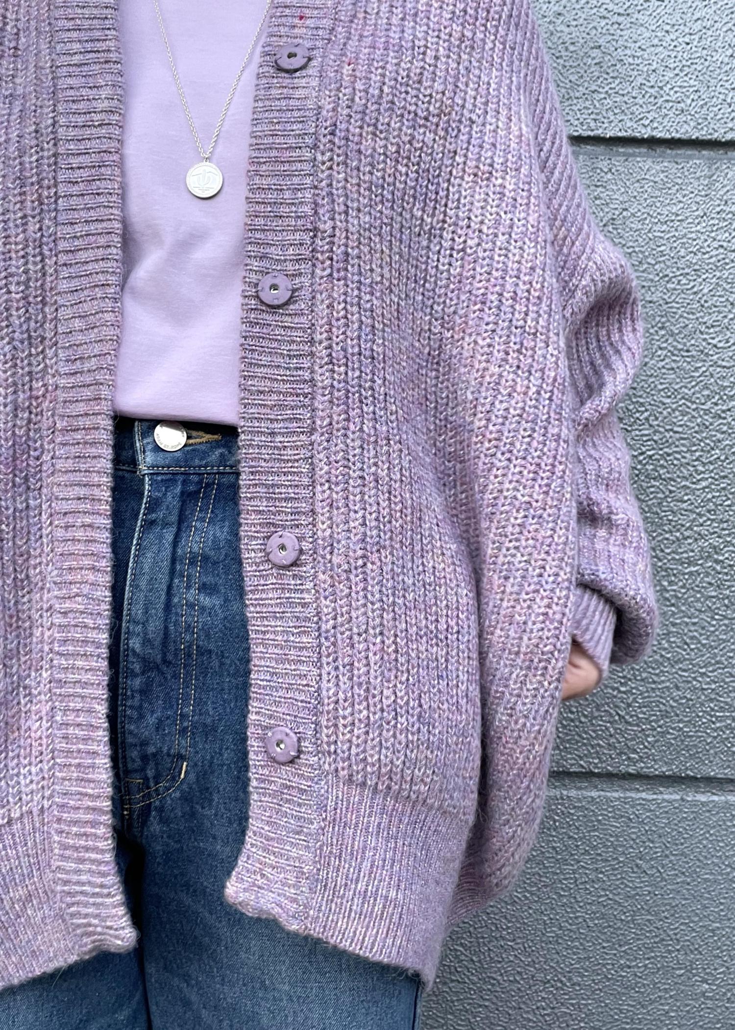 ふわふわでやわらかなヘアリーな素材のボタン付きニットカーディガンです。