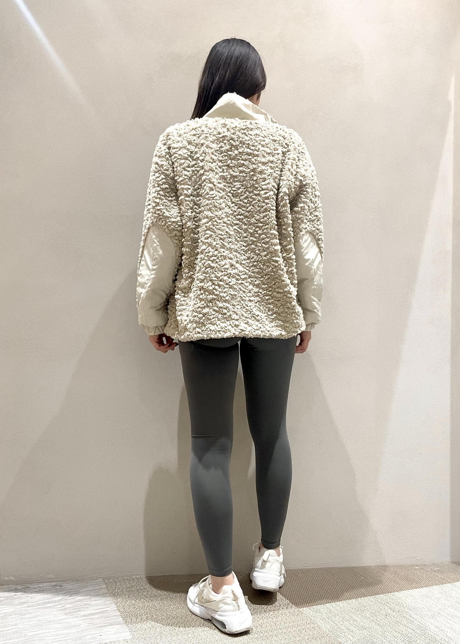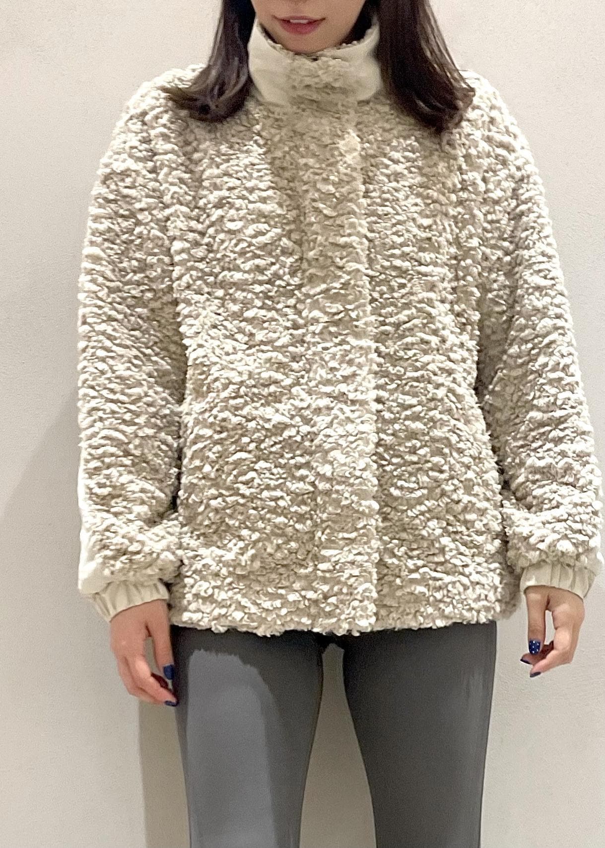 暖かみのあるプードルボアジャケットを使ったコーディネートです。