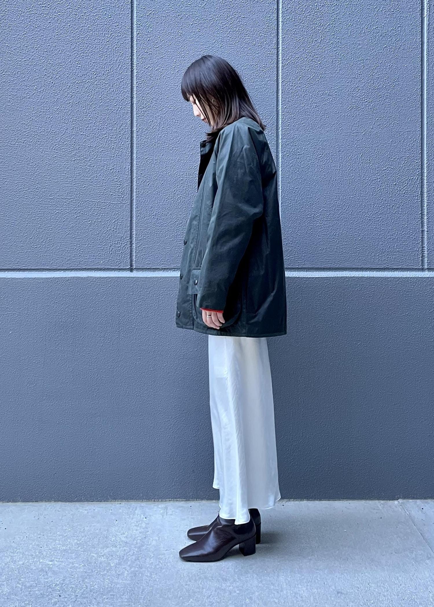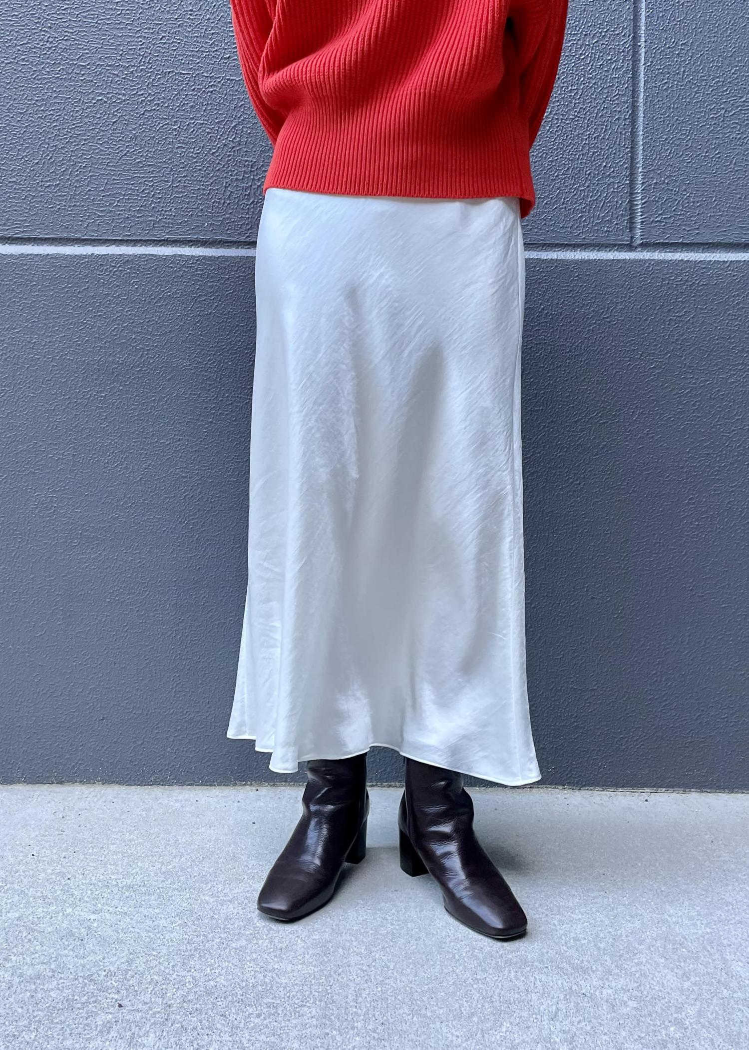 どこか女らしさをプラスするスタイルが好きなので、今回はサテンスカートを合わせてみました。