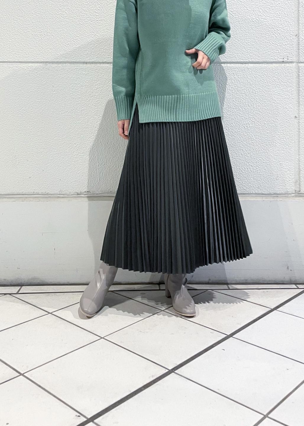 トレンドカラーのグリーンとレザープリーツスカートを合わせた、シンプルスタイルです。
