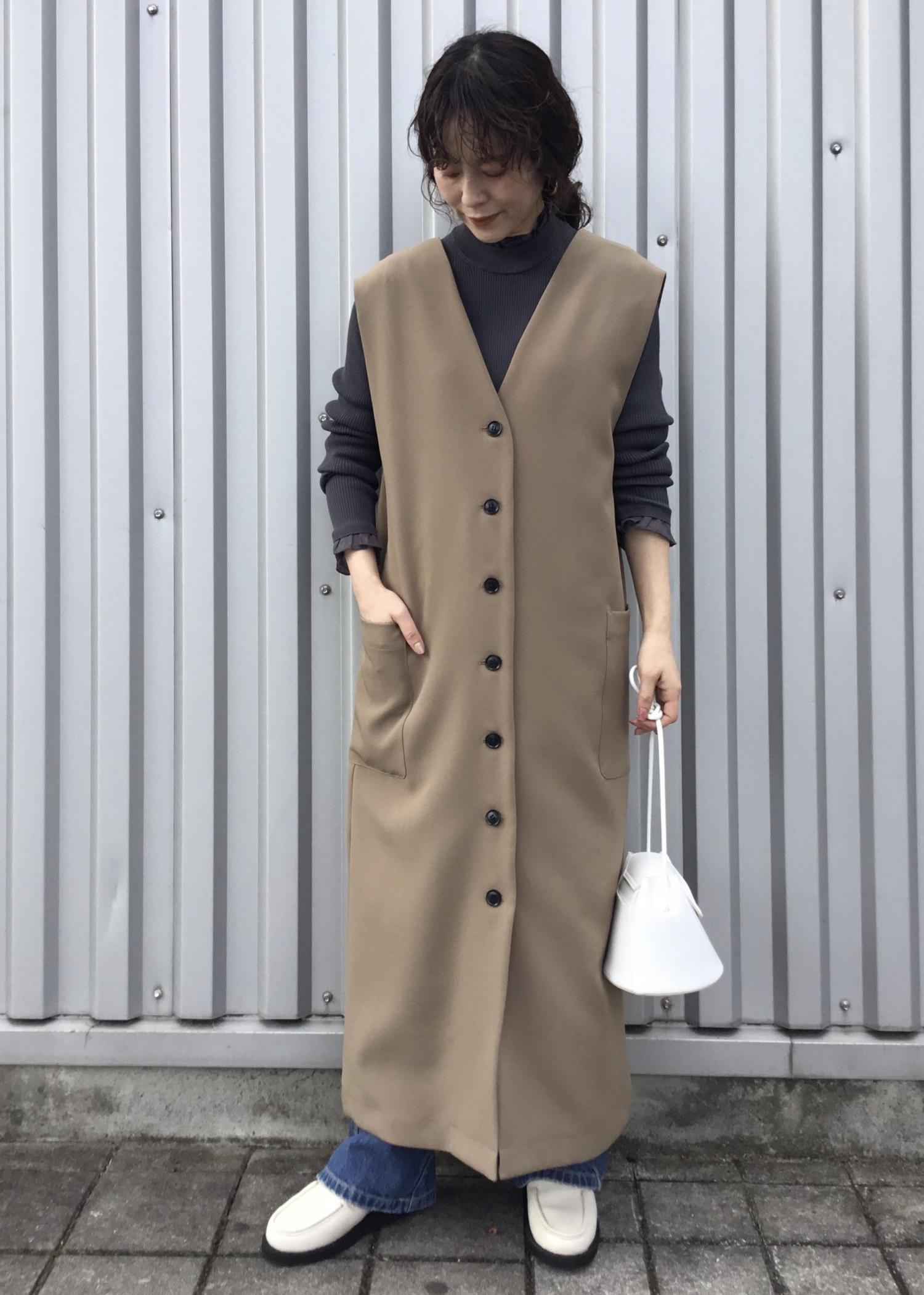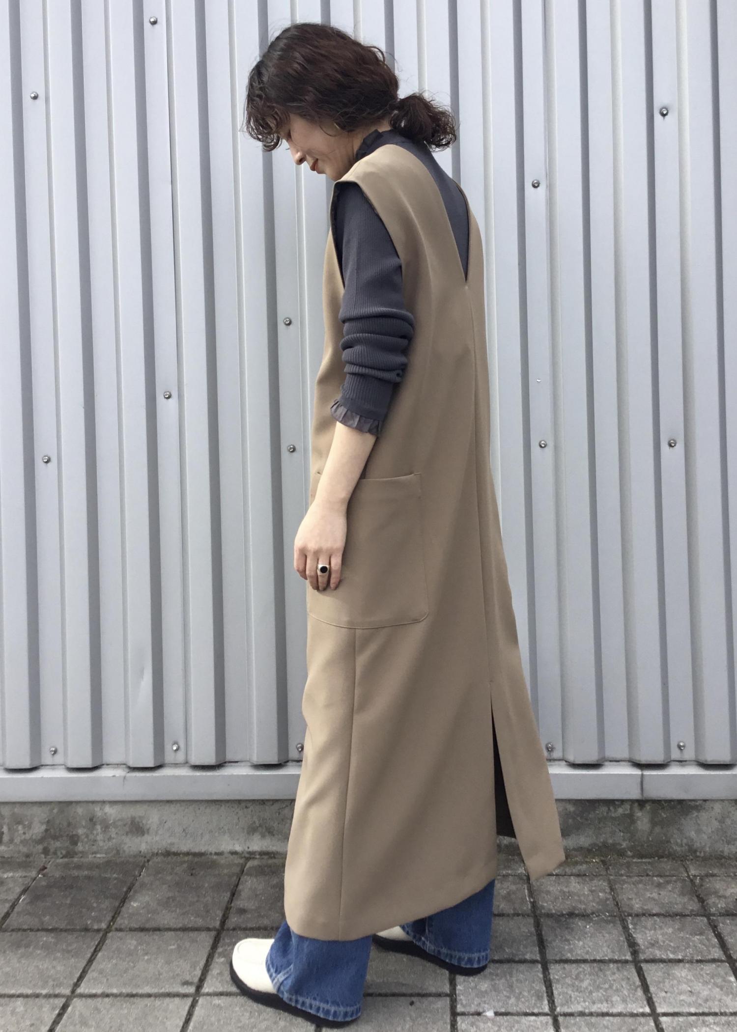 ワンピースとしては勿論ですが、前開きにしてロングジレとしても、レイヤードを楽しめる万能なワンピースです。