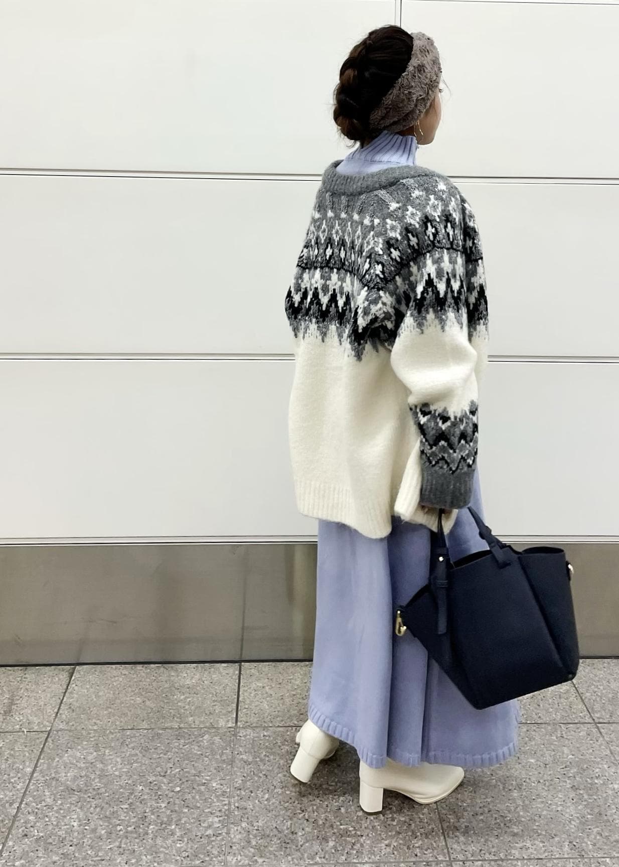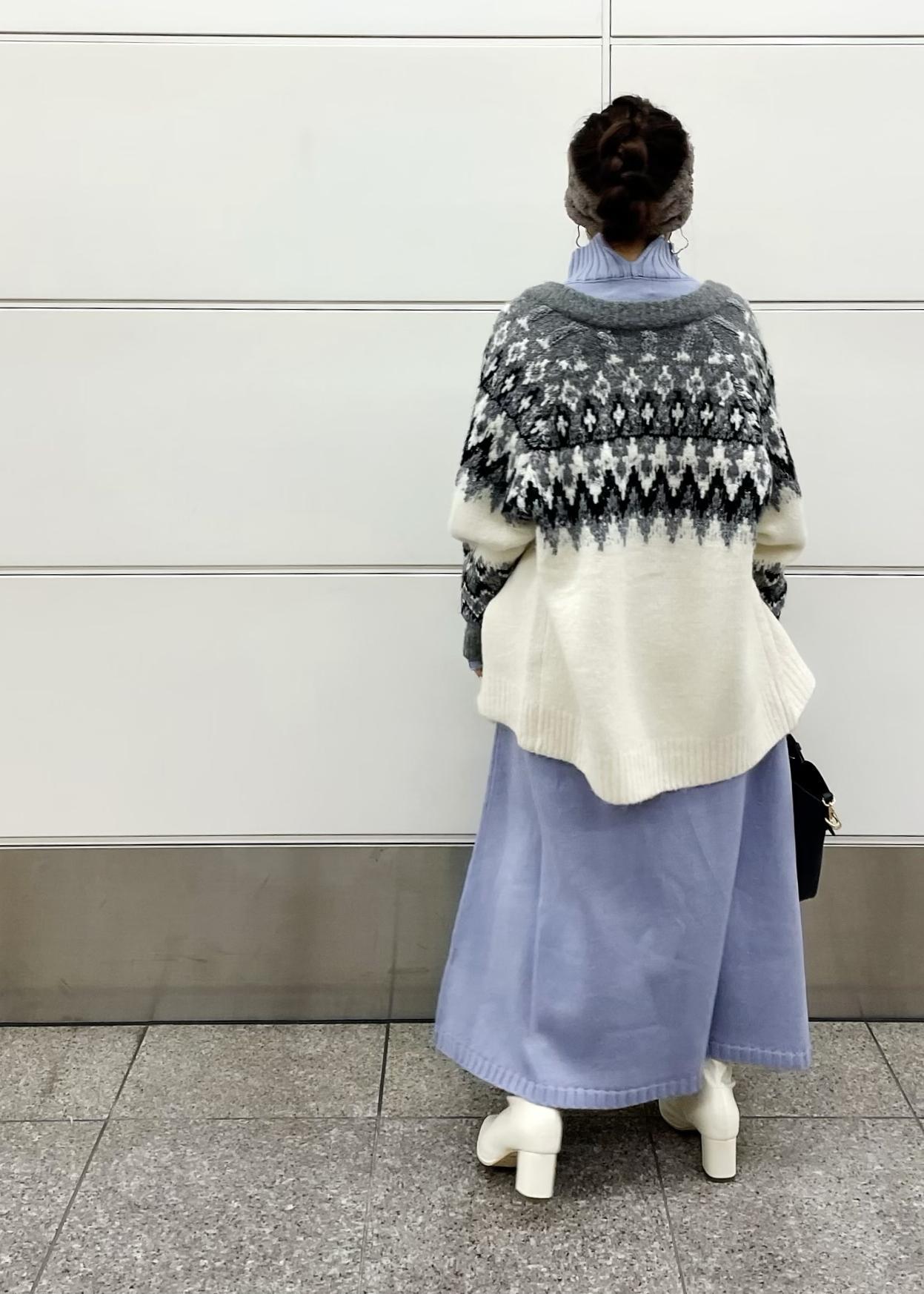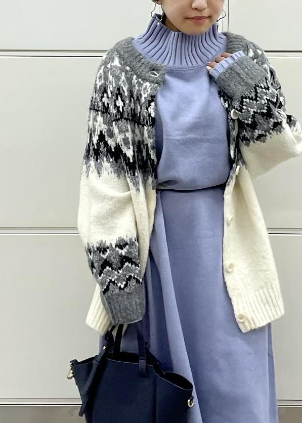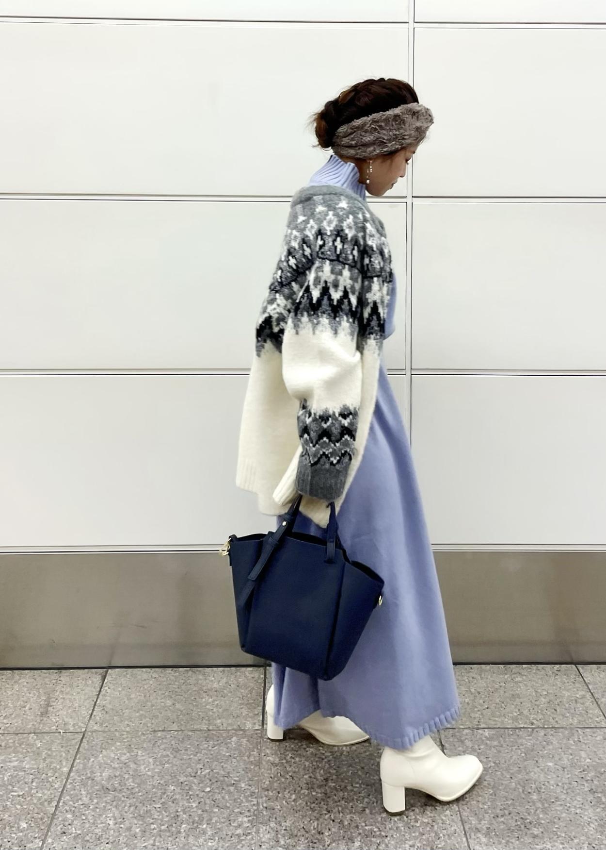 ブルーの綺麗目カラーワンピースに厚地のノルディックカーディガンを合わせて楽ちんなのにすっきり見えるコーディネートにしました☺︎