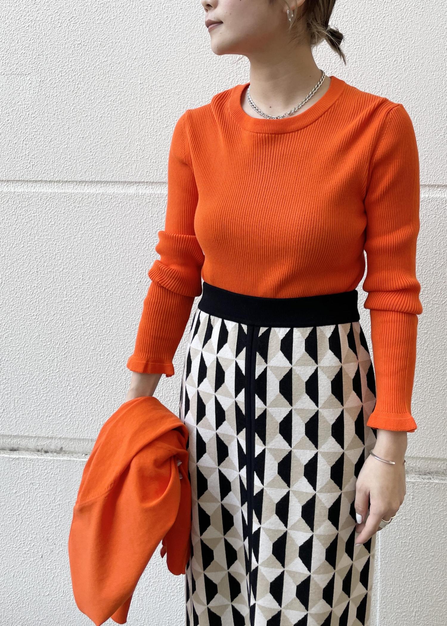 程よく身体のラインが出て、メインでも着れるRIBプルオーバーです。袖のフリルや手の甲まで隠れる袖丈の為甘すぎず、また腕もすらっと長く見せてくれます☺︎
