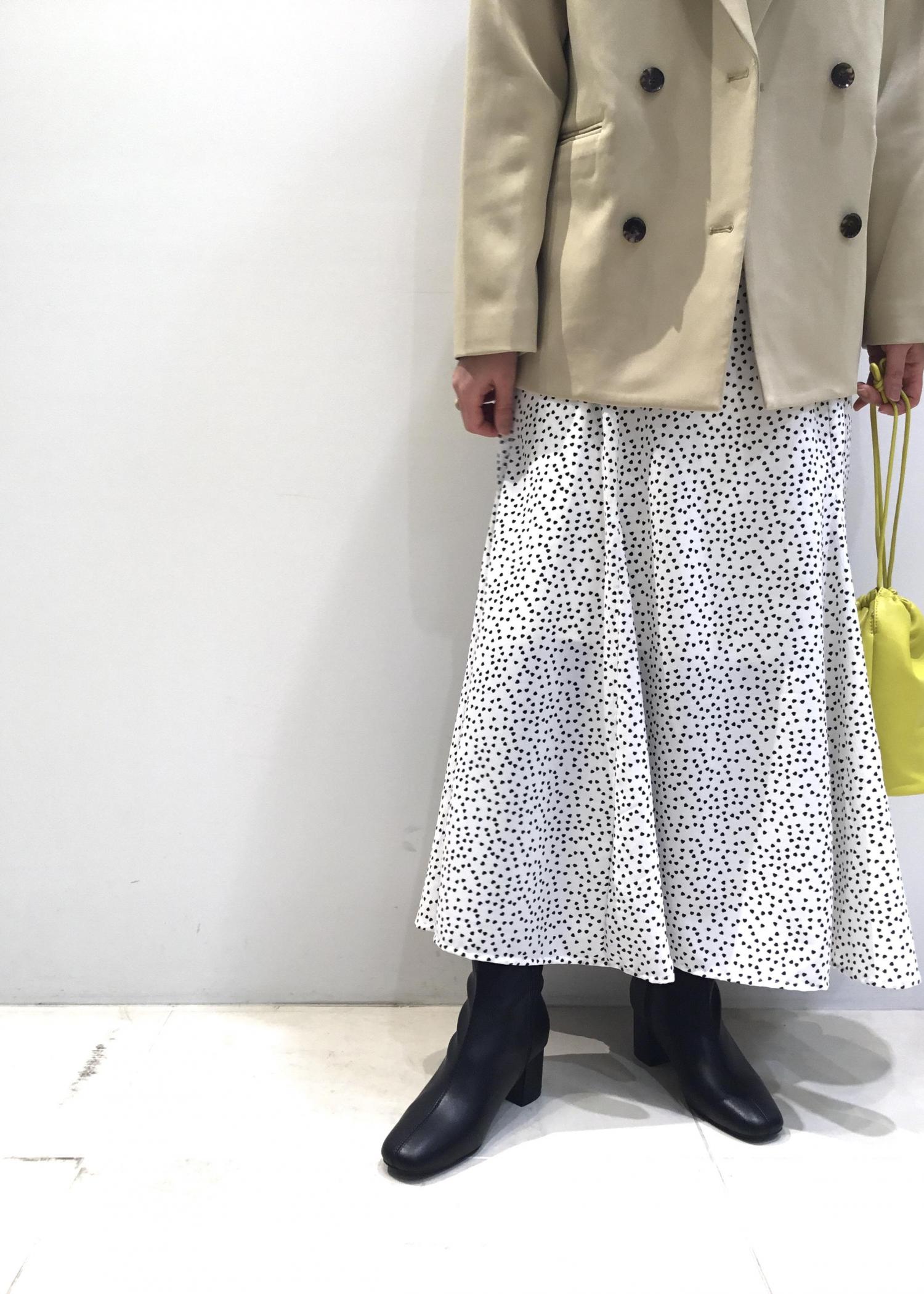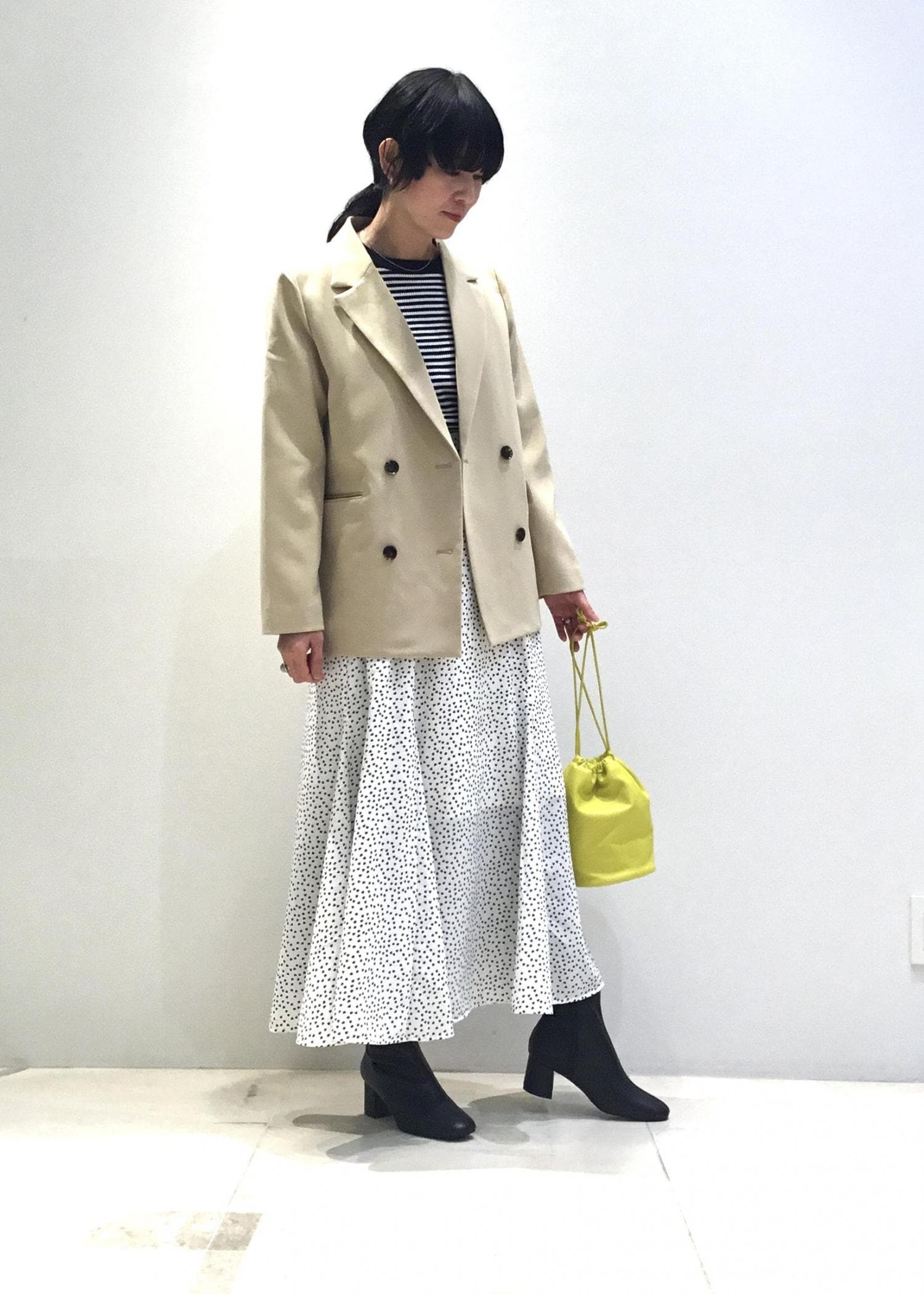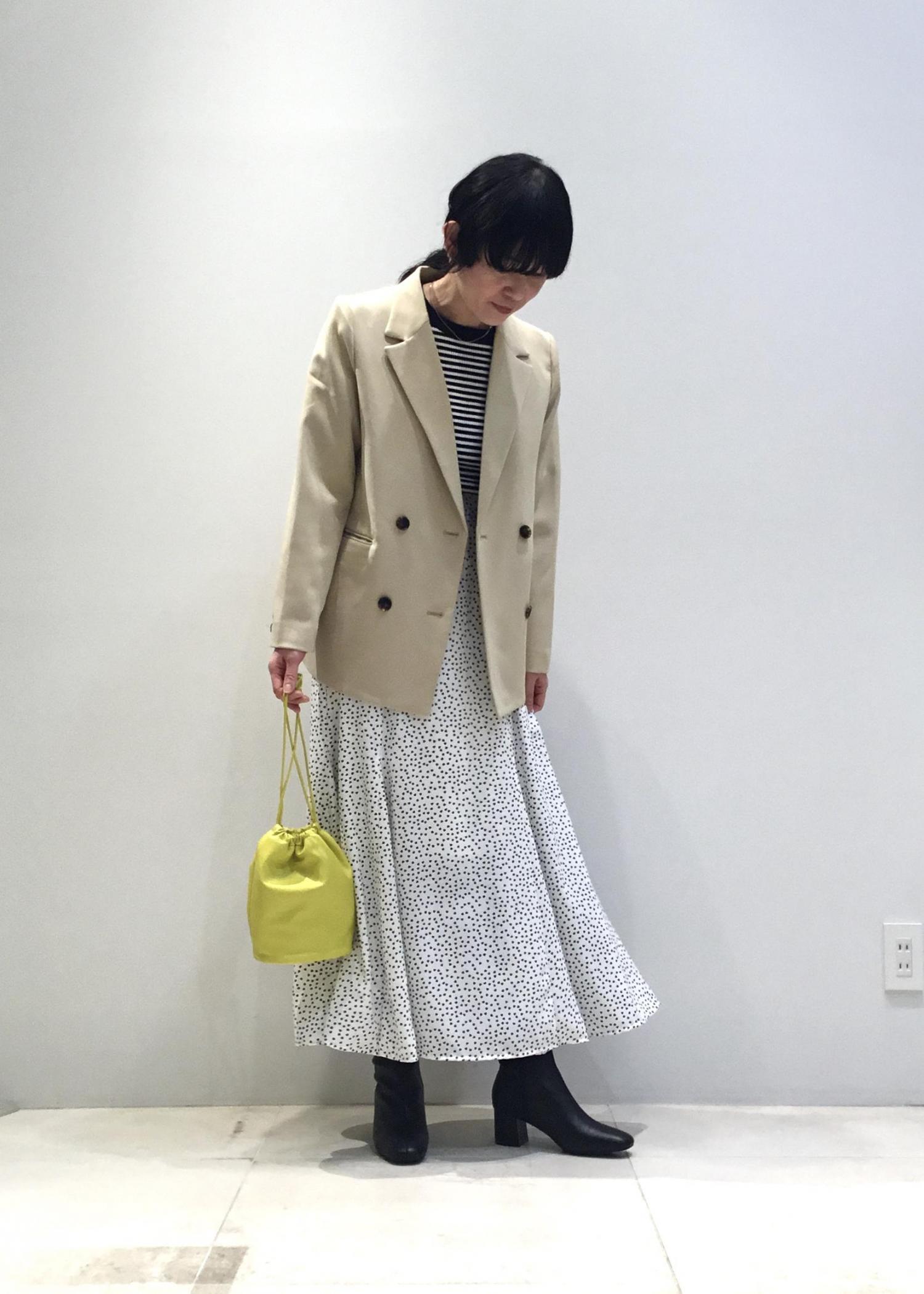 モノトーンをベースにした柄コーデにブレストジャケットを羽織り、落ち着いたフェミニンコーデにしてみました♪