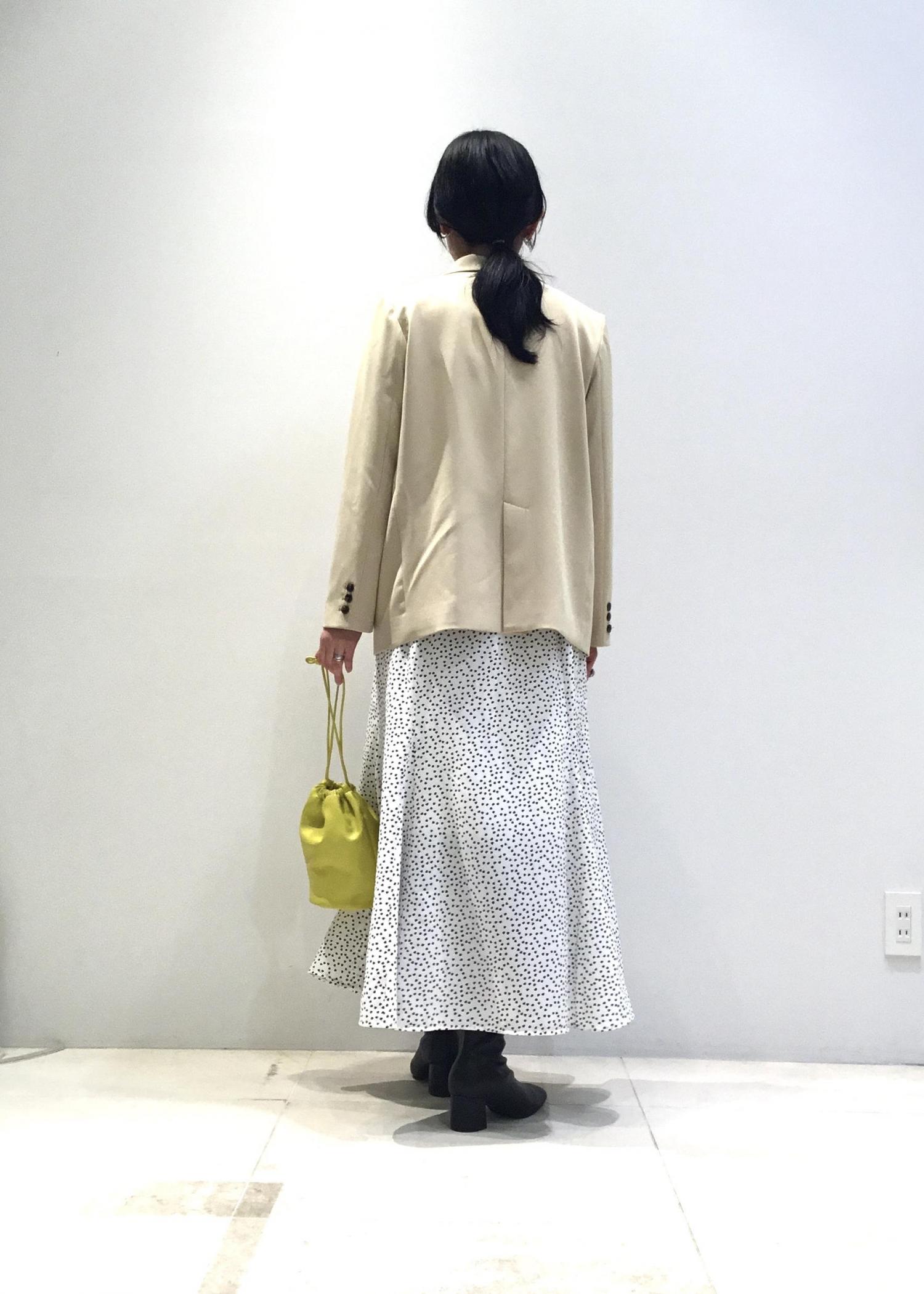 こちらのジャケットはセットアップで着られるパンツも展開しているのですが、ボトムをマーメイドスカートにチェンジするだけでグッと甘さが加わります