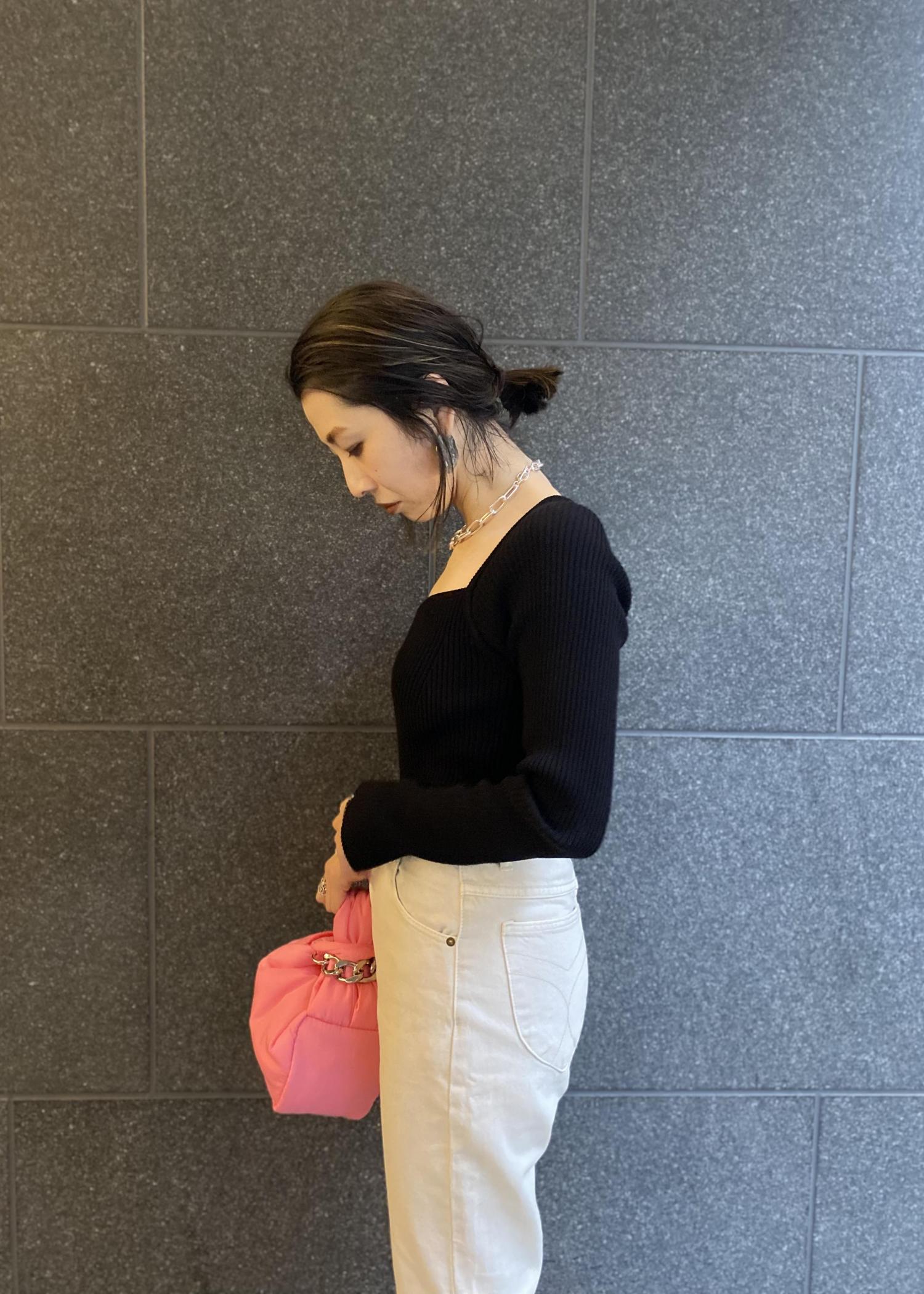 スクエアに広がった胸元のデザインがとても女性らしく印象的なプルオーバー。ニットにカップがついていて、インナーなしでそのまま着用ができるんです。