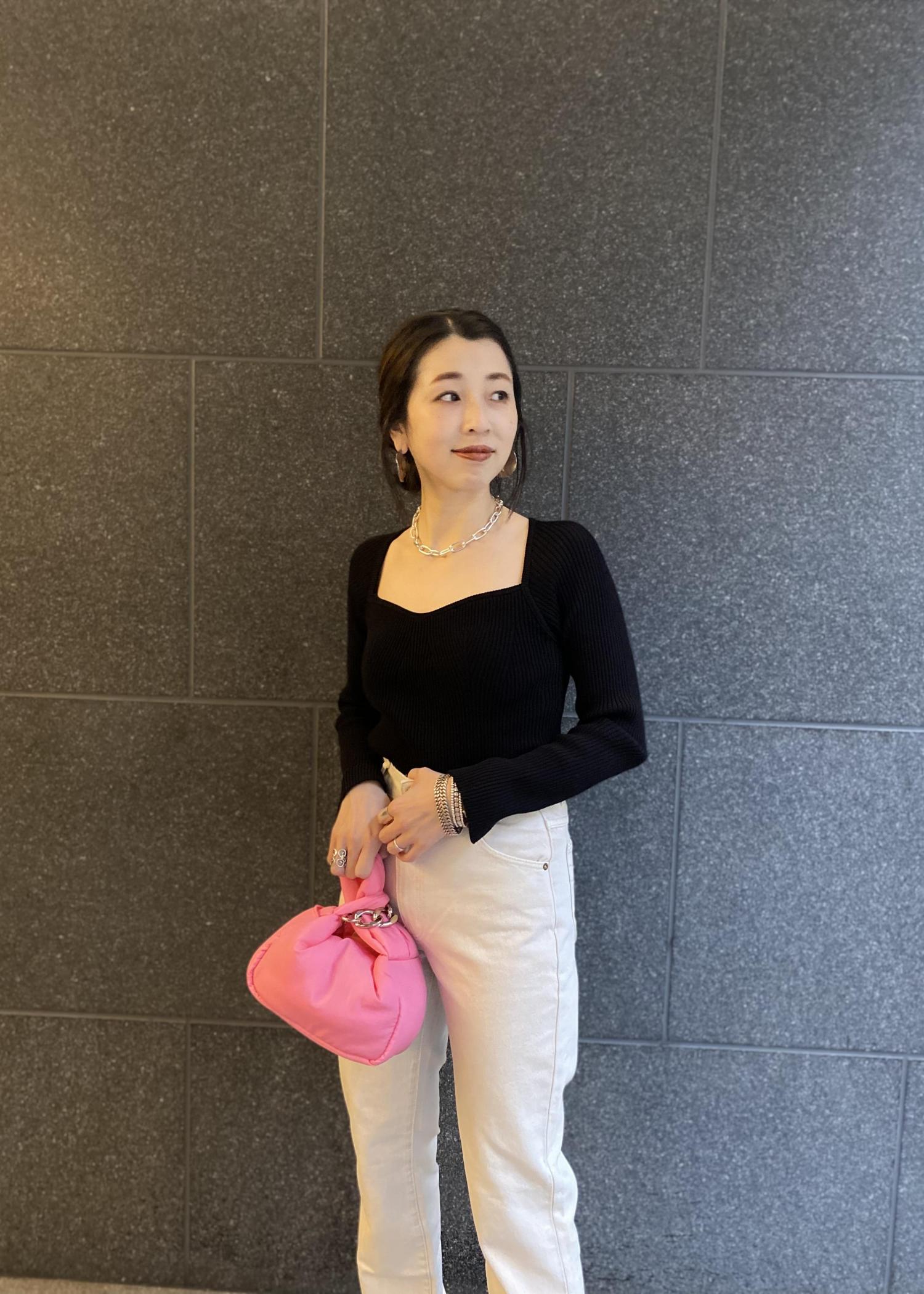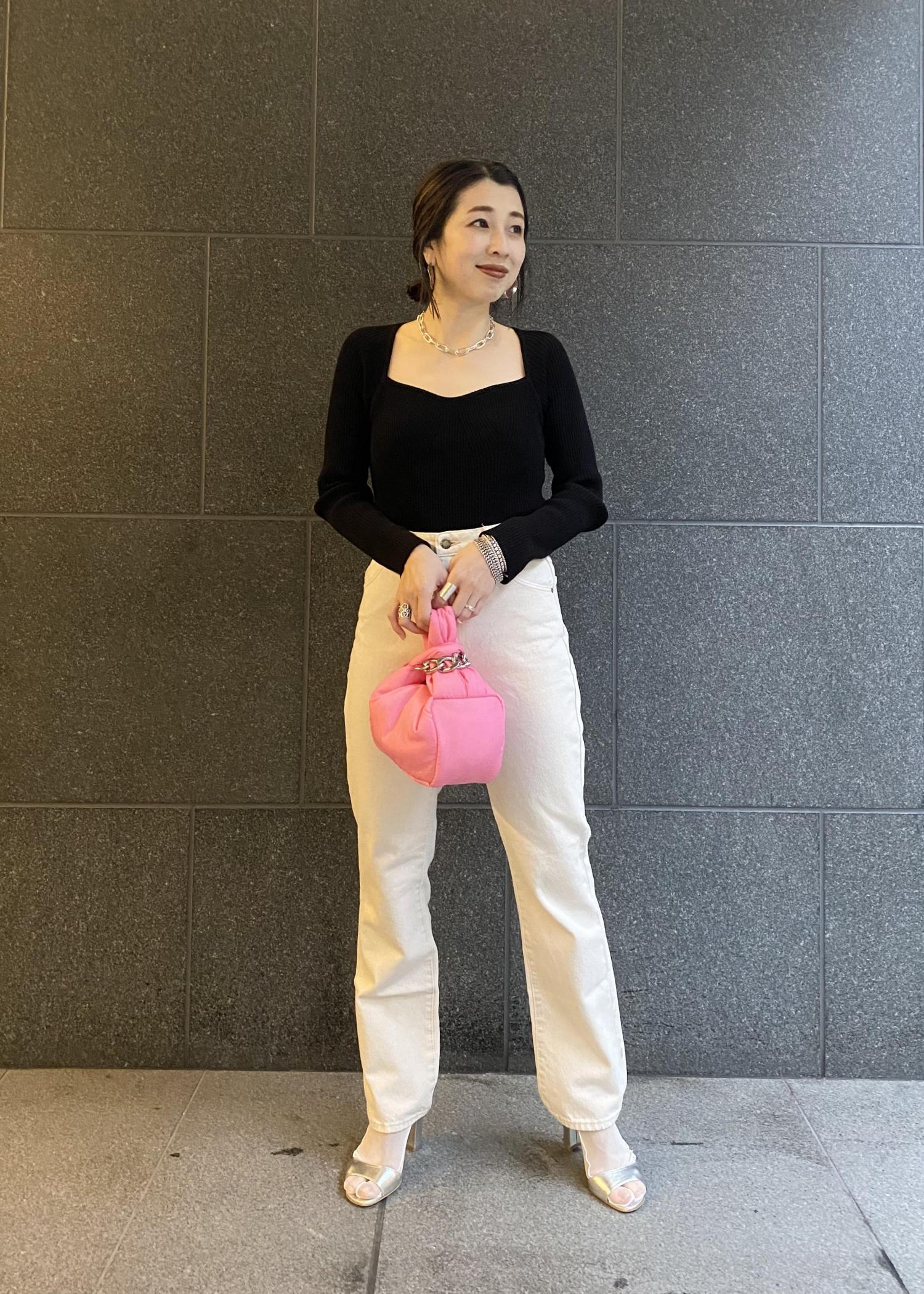 今回はシンプルに白デニムにバッグはあえての可愛いカラーのピンクでコーディネートしてみました。