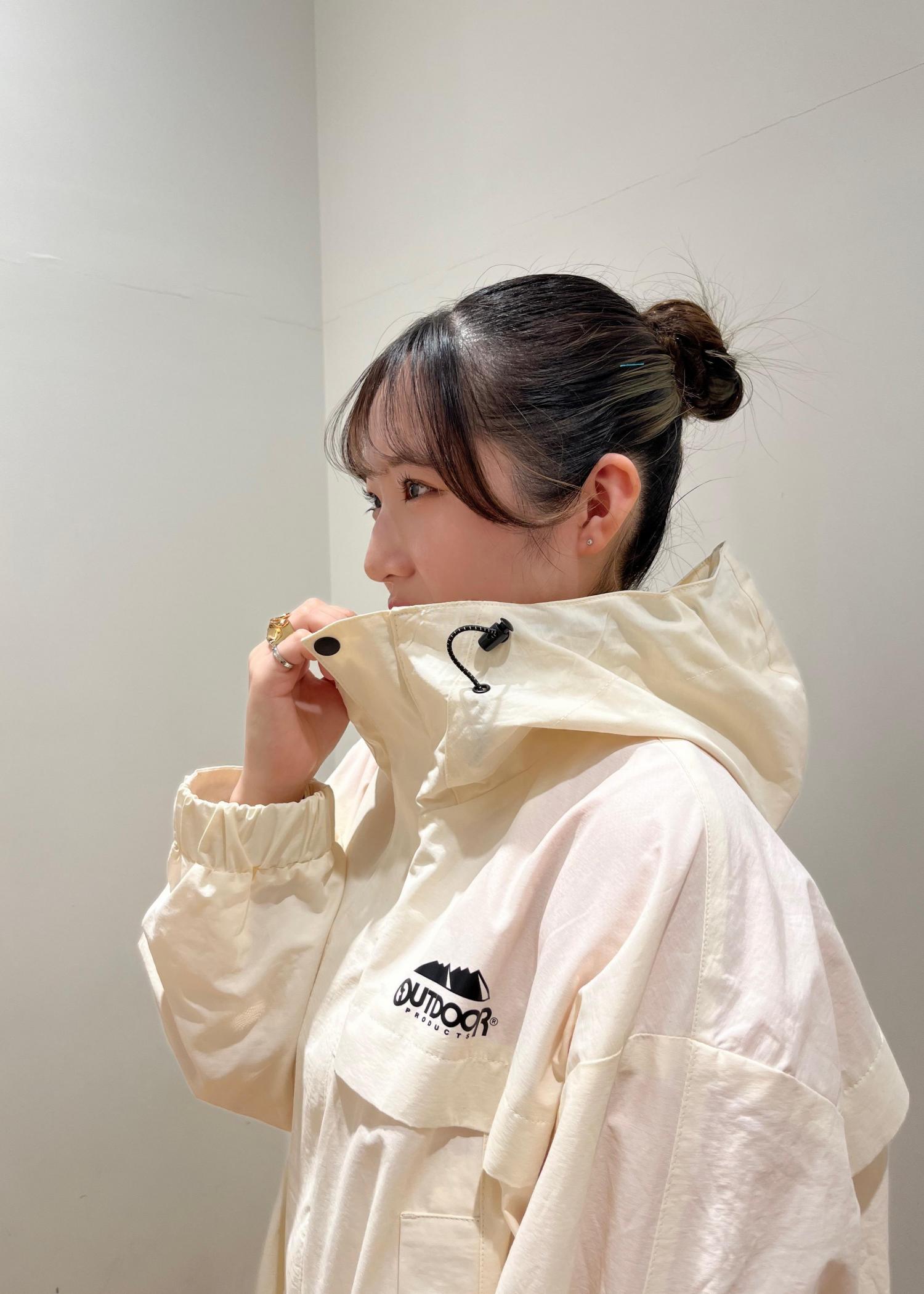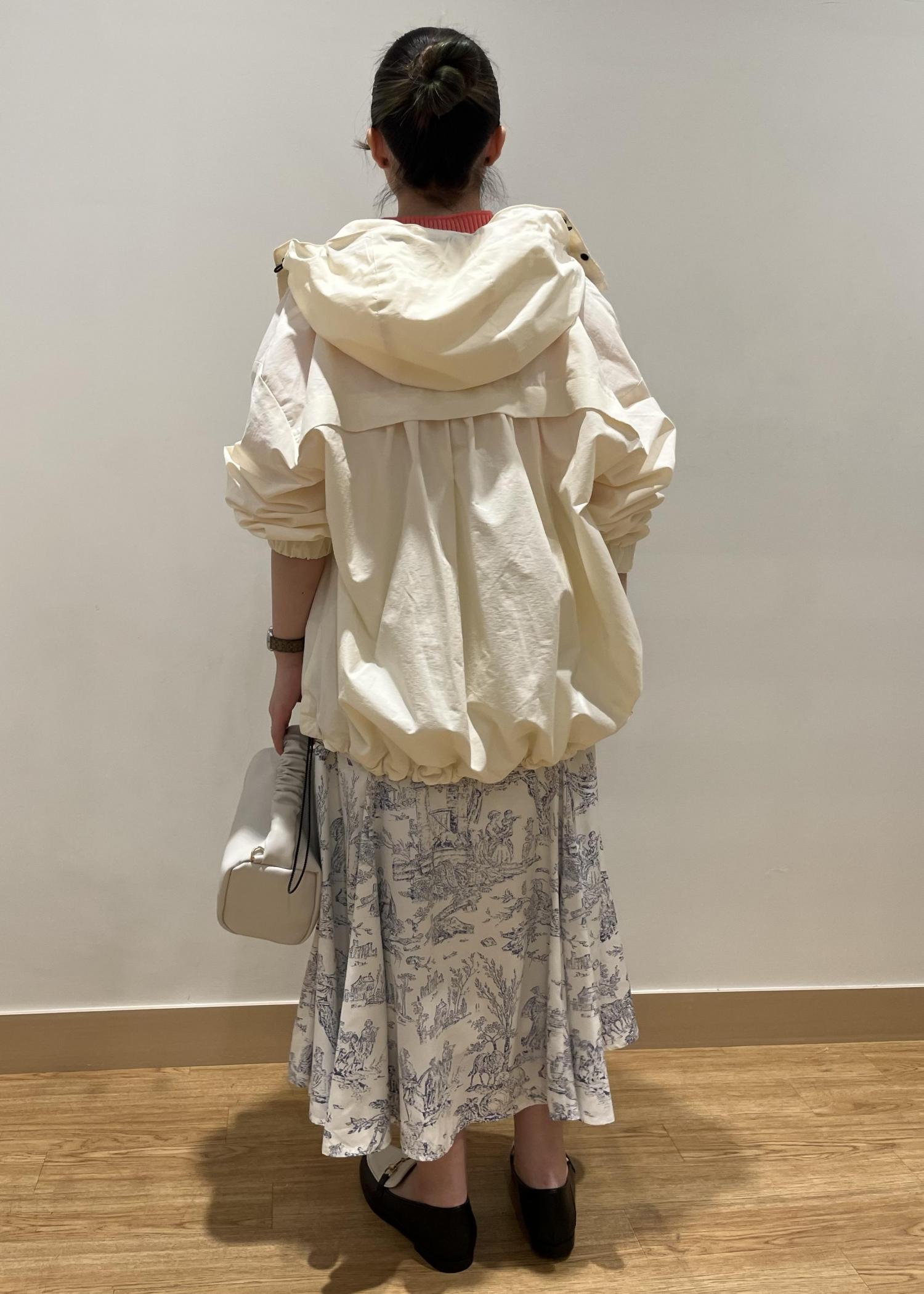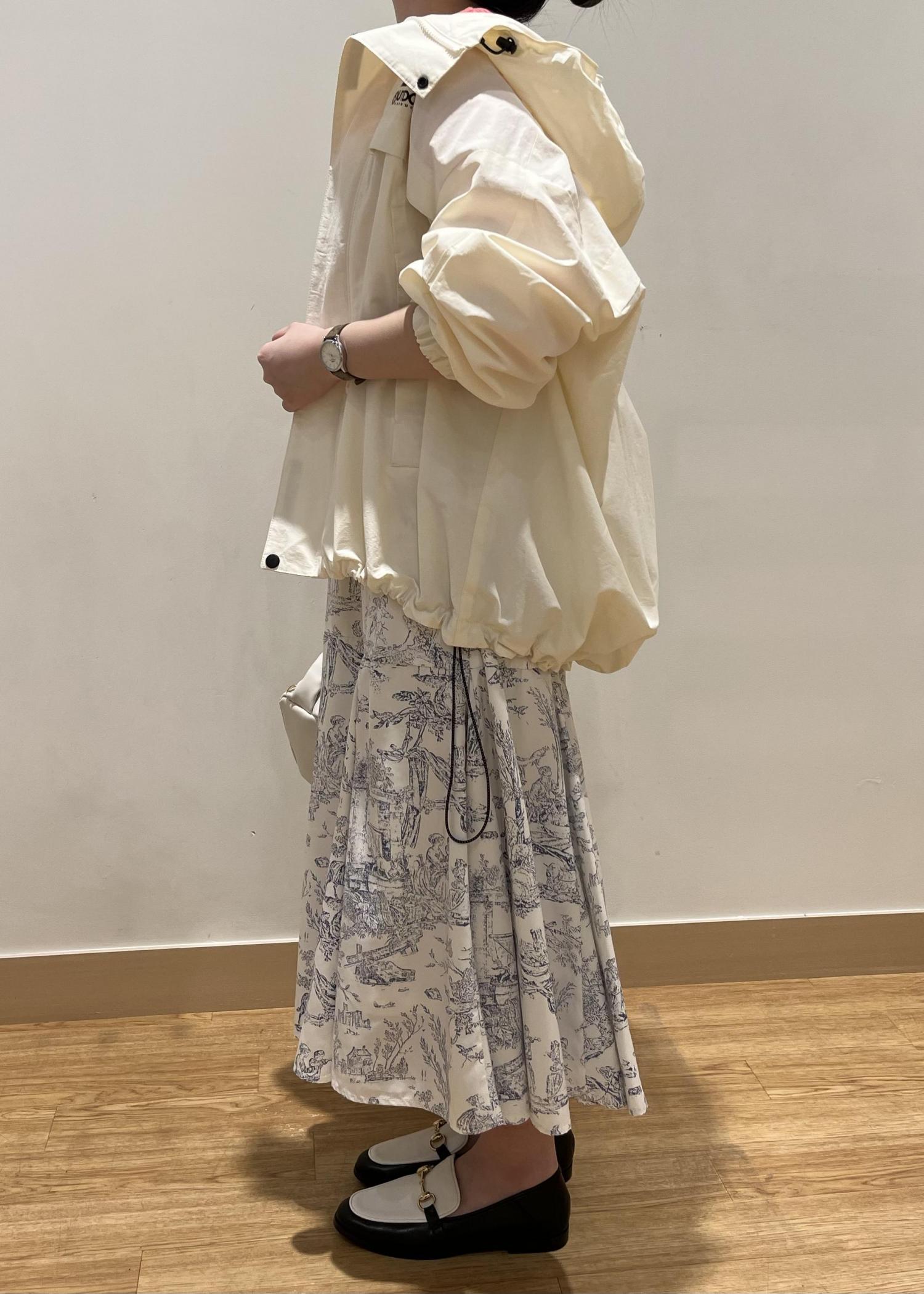 マウンテンパーカーとスカートを合わせて、甘めカジュアルにしました。