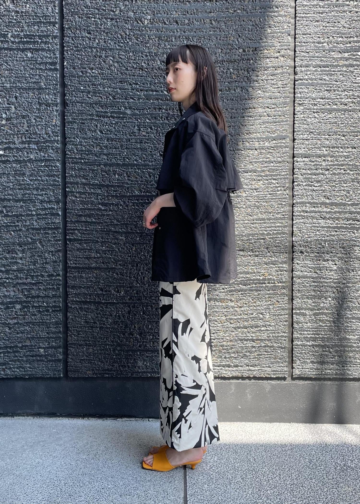 襟まわりは高めのスタンドカラーで華やかに仕上げているので、開けても閉めても様になるデザイン。