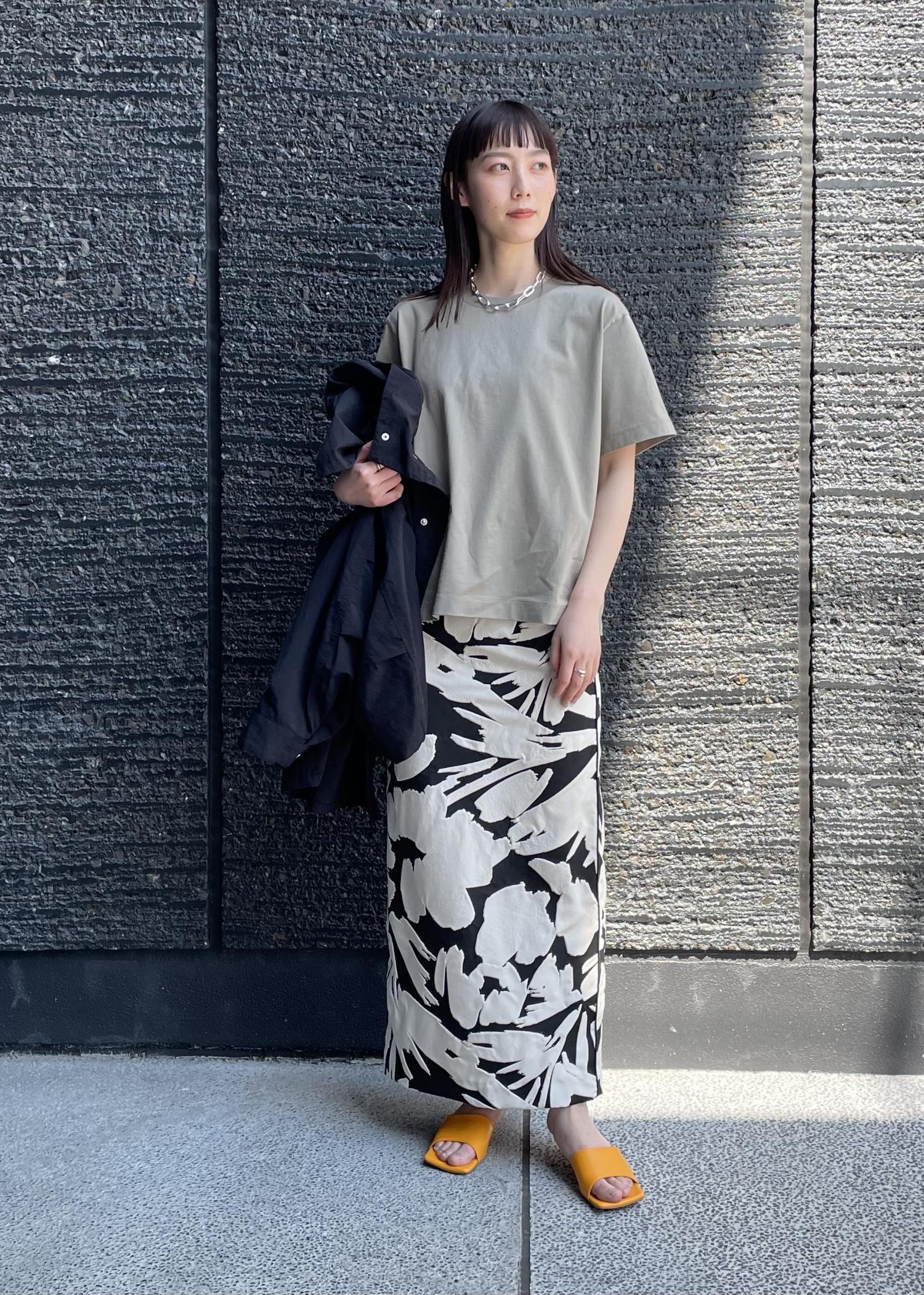 今回は柄のタイトスカートで個性を残しつつも、落ち着いた色味で合わせみました。