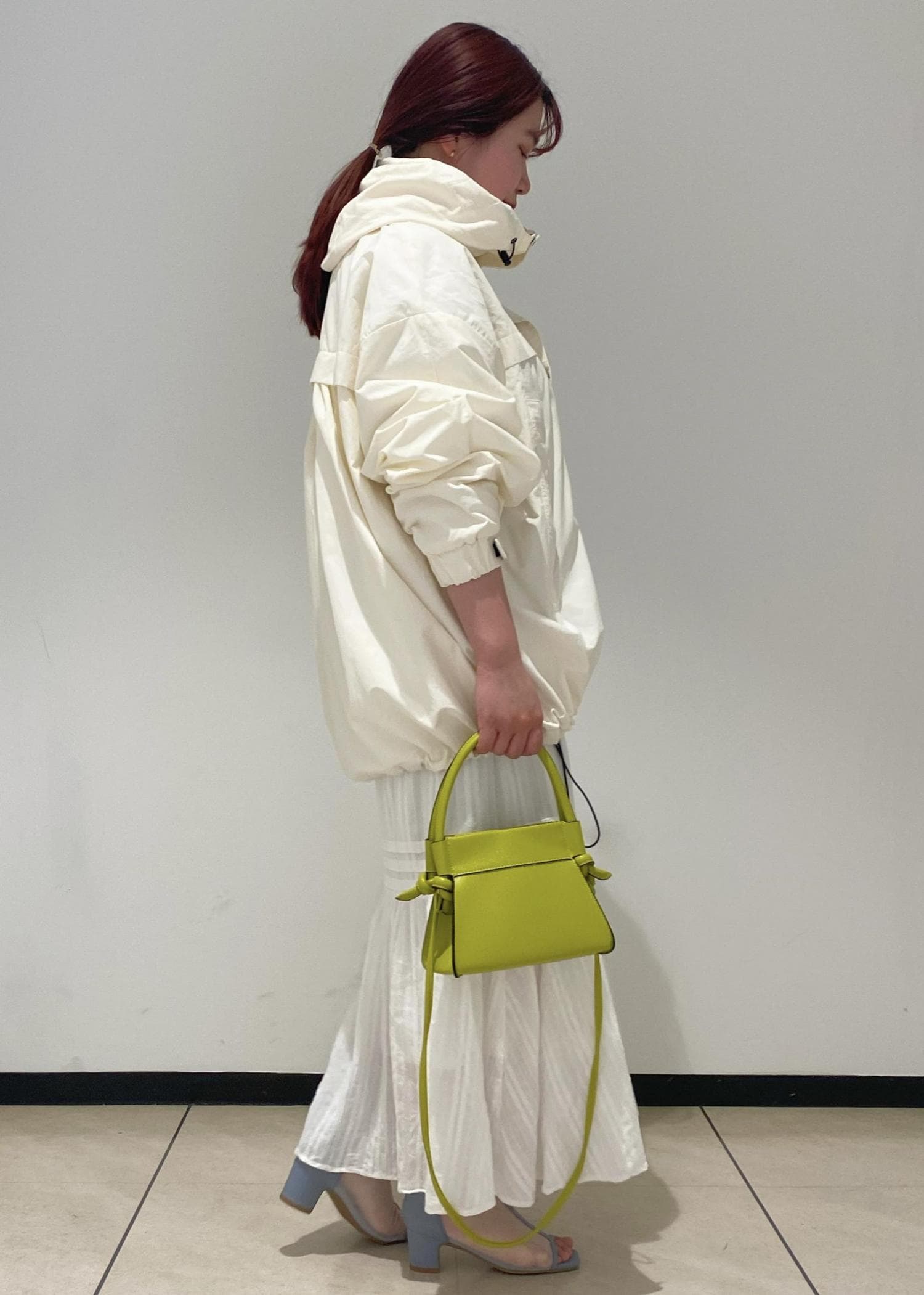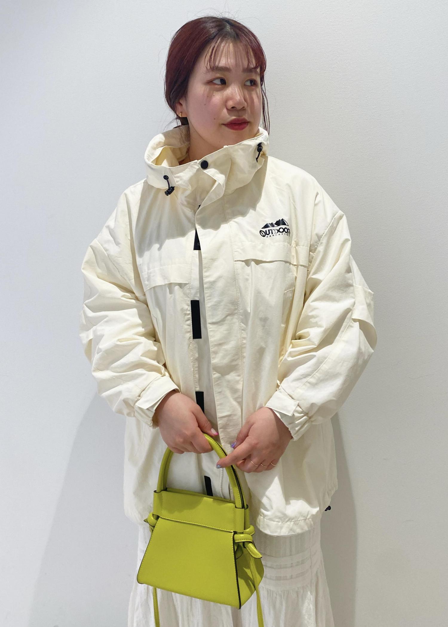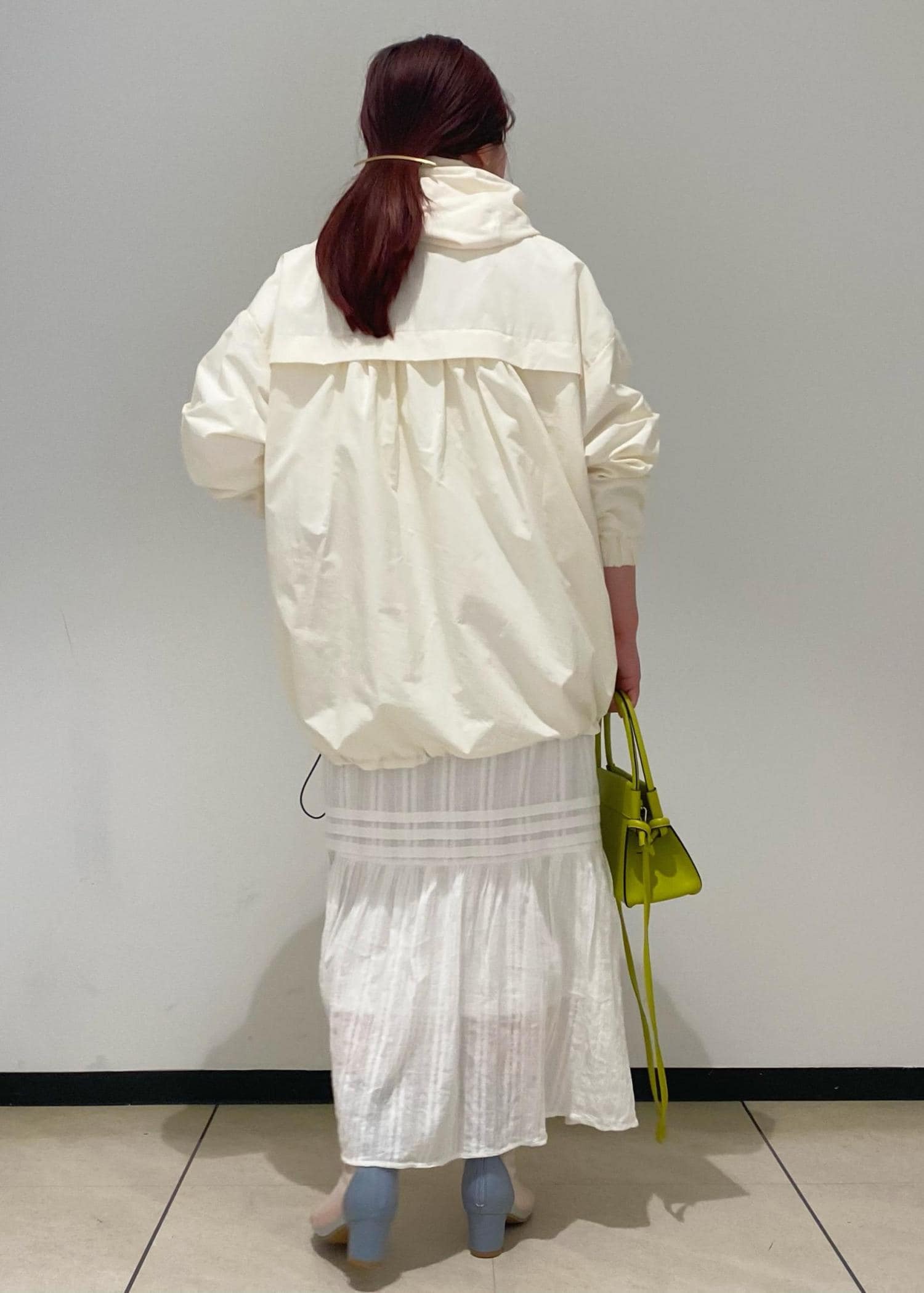 OUTDOORPRODUCTコラボのマウンテンパーカーと、白のマーメイドスカートを合わせてワントーンコーデです♪