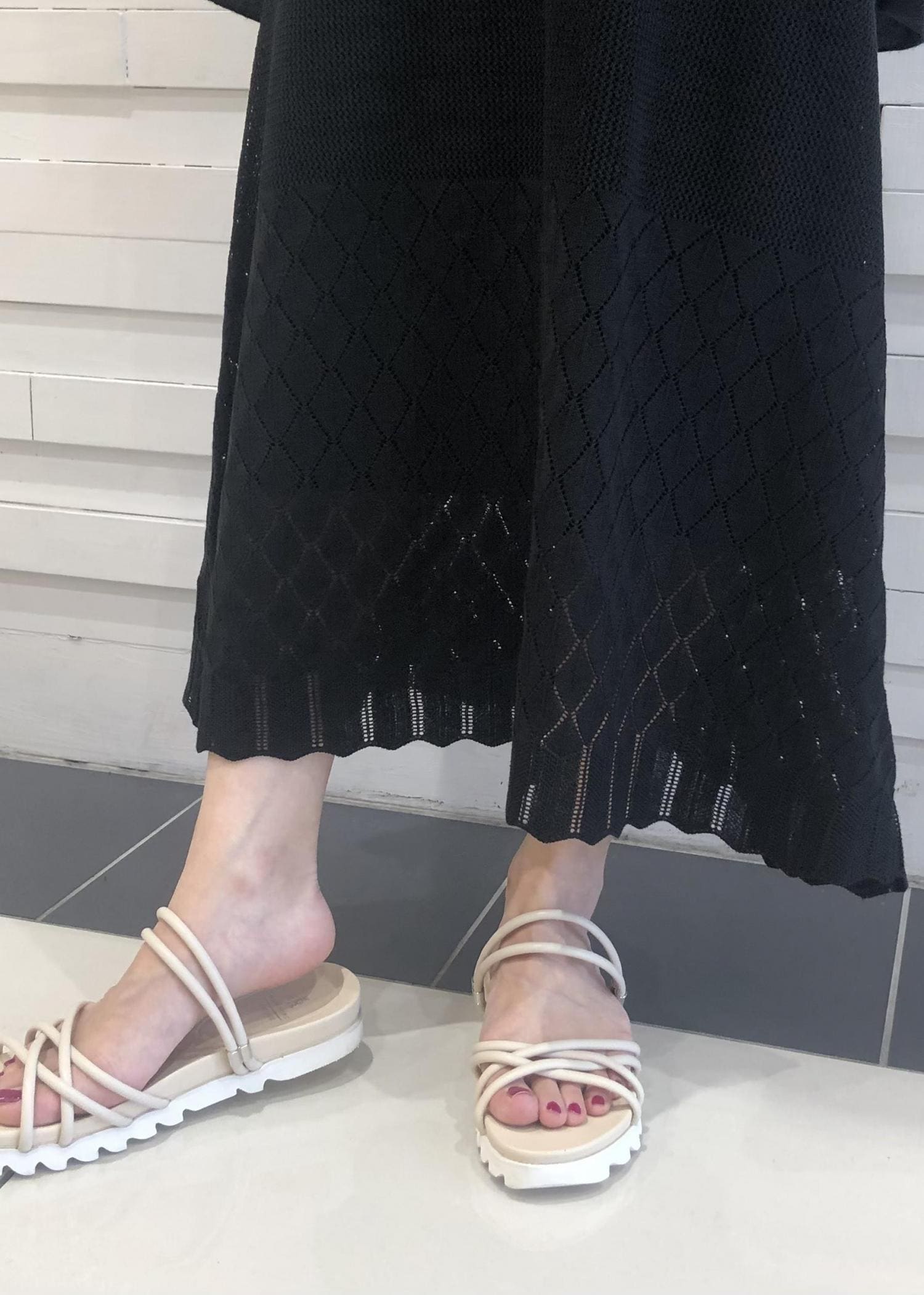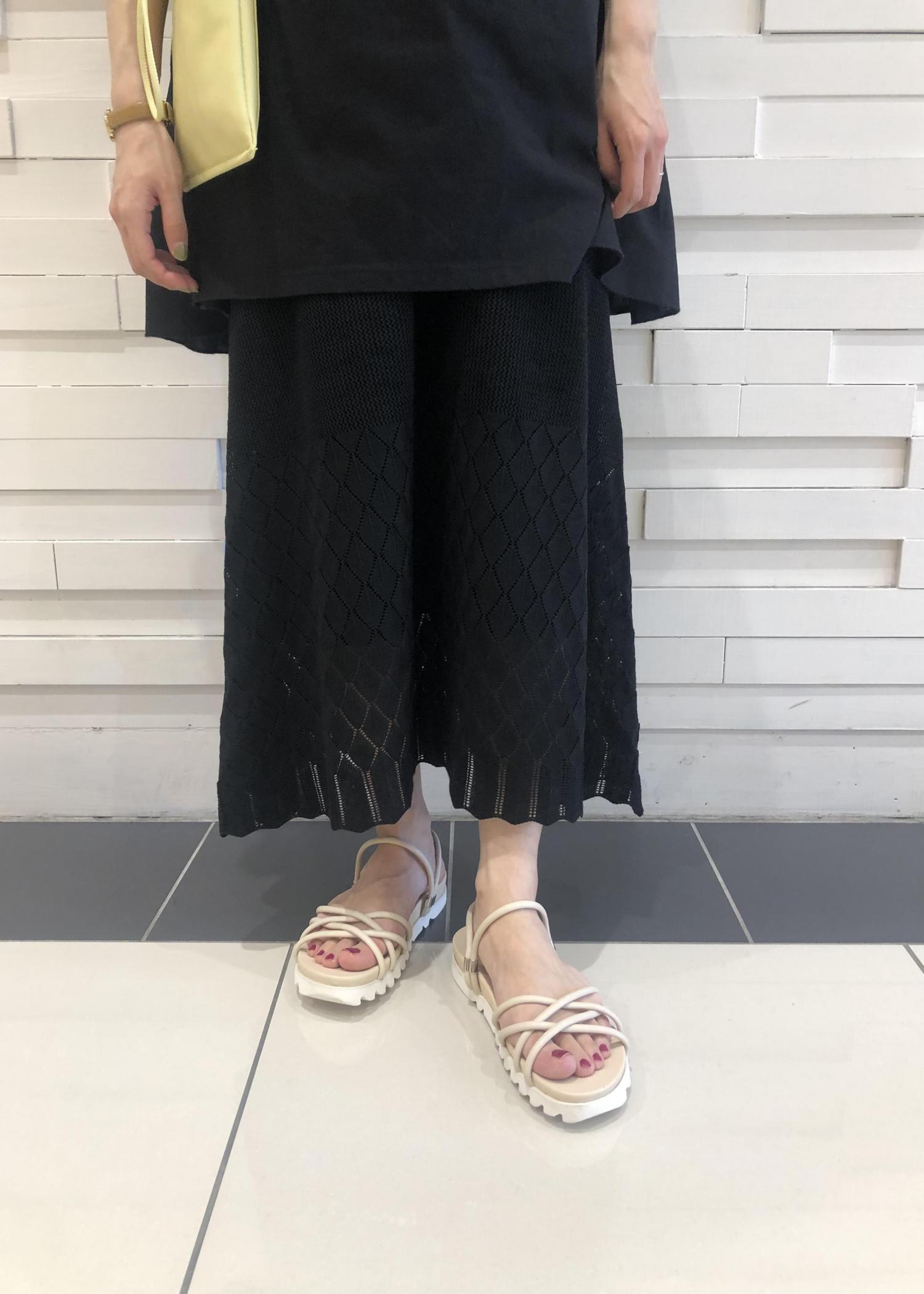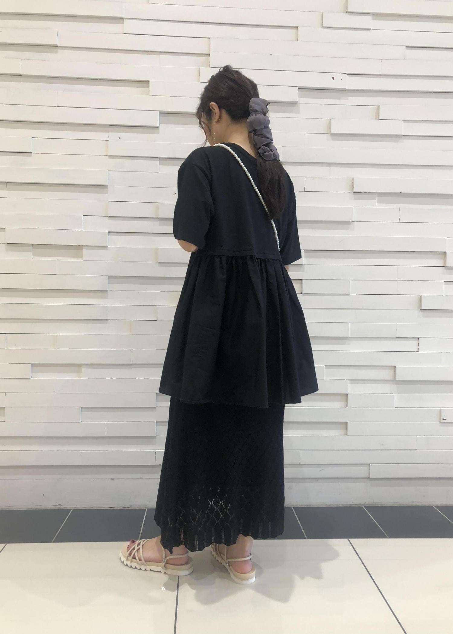トップスは後ろの素材切り替えデザインや、スカートも透かし編みで、全身ブラックでも立体感のあるコーディネートに♫