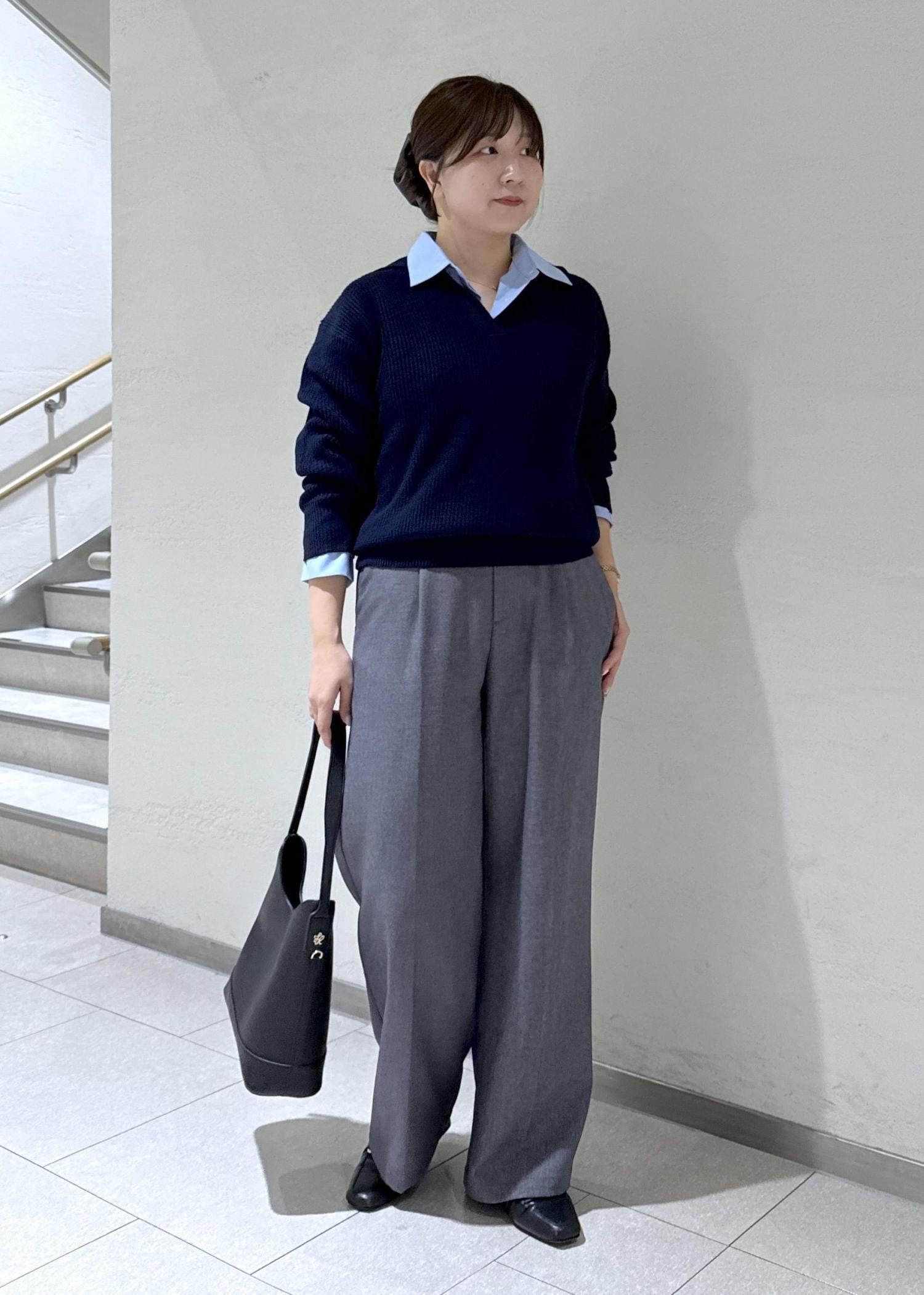 リラックス感あるパンツはハイゲージニットやシャツとあわせたスタイリングがおすすめ。